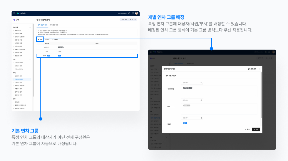 새로운 방식의 ‘연차 그룹’을 추가해 두고, Admin > 근태 > 부재 > 연차 대상자 관리에서 추가한 연차 그룹에 특정 대상자(사원/부서)를 배정합니다. 특정 대상자로 배정되면, 기본 그룹 방식보다 배정된 연차 그룹의 방식이 우선 적용됩니다.