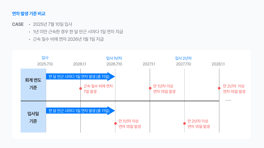 반면, 입사일 기준에서는 근속 일수 비례 연차는 발생하지 않으며, 입사 다음 해부터 매년 입사일에 연차가 발생해요.