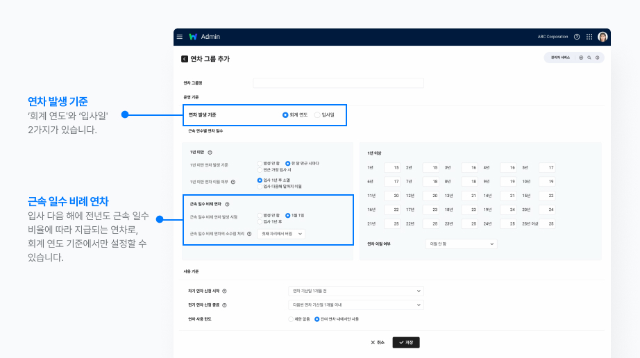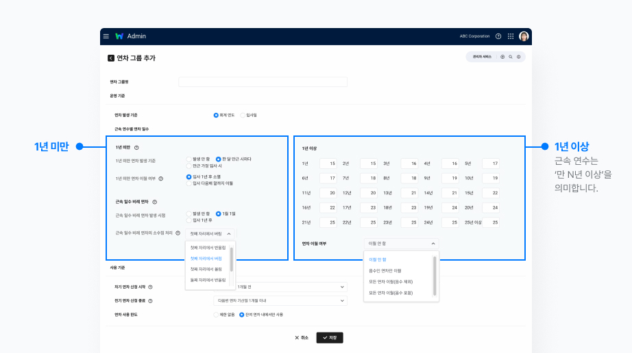 A. 연차는 근속 1년을 기점으로 계산 방식이 완전히 달라지기 때문에, 연차 그룹 설정도 두 영역으로 분리되어 있어요.