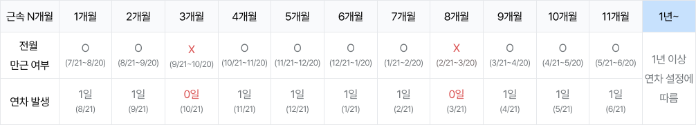 회계 연도 기준과 입사일 기준 모두 동일하게 입사 후 첫 1년 동안은 매월 만근 시 1일의 연차가 발생해요.