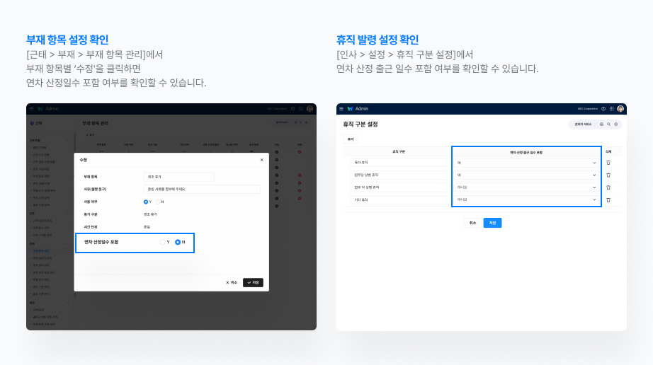 - 부재 항목의 경우, Admin > 근태 > 부재 > 부재 항목 관리에서