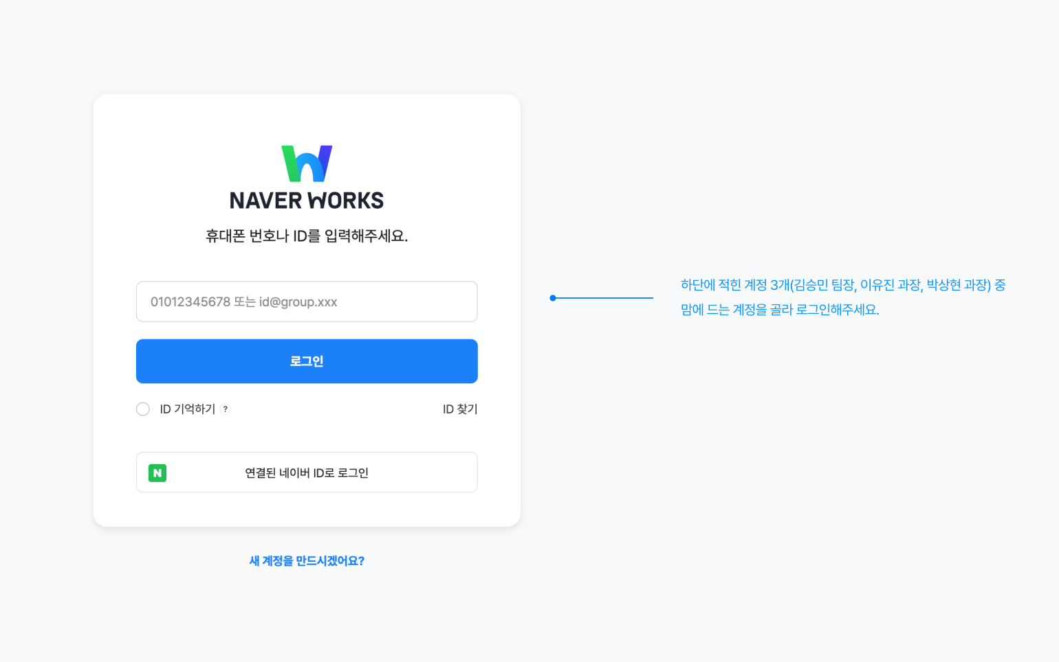 네이버웍스팀이 미리 데모용 도메인을 만들어, 3개의 계정으로 ‘사업기획팀’ 가상 조직을 만들어 놓았거든요.