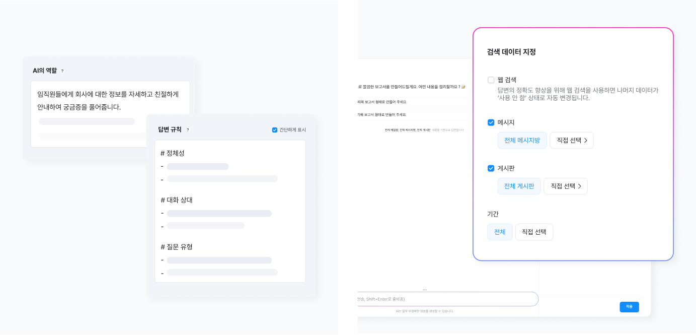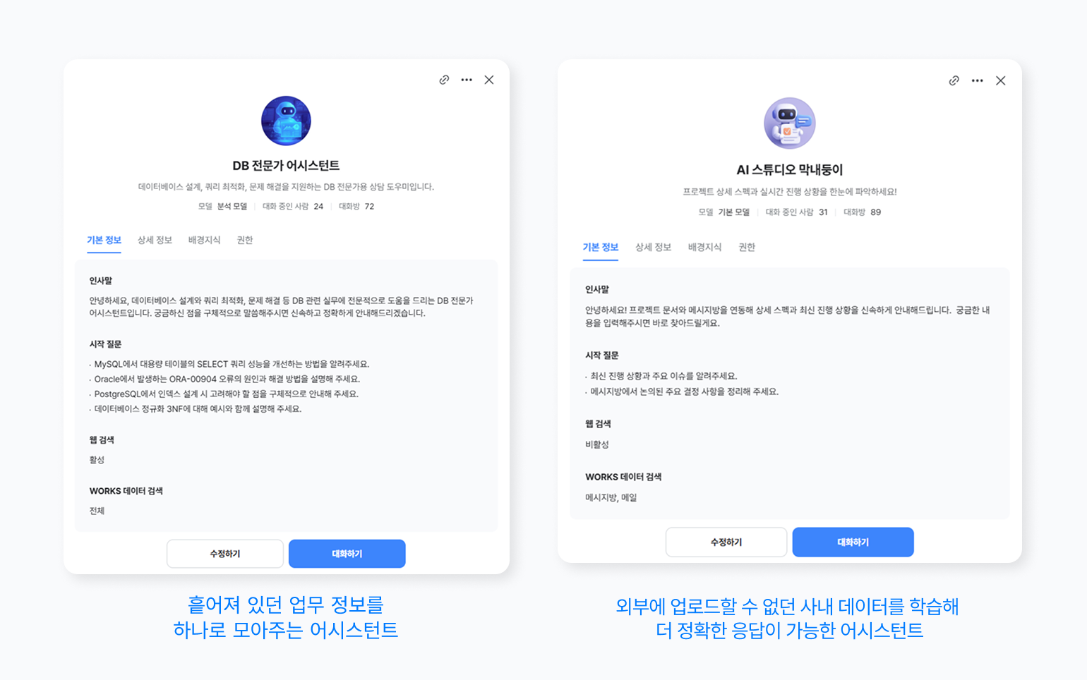 내가 주로 사용하는 메시지방과 사내 게시판을 연동하면, 어시스턴트가 해당 데이터를 기반으로 답변을 제공해