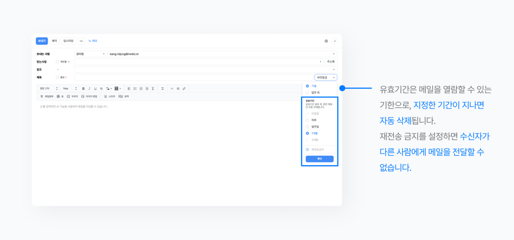 - 유효기간: 메일을 확인할 수 있는 기한으로, 설정한 유효기간이 지나면 메일이 자동 삭제됩니다.