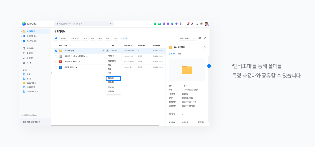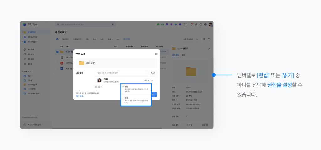 - 드라이브 내 폴더 단위로 권한을 설정해 특정 사용자만 열람, 수정, 다운로드할 수 있도록 제한하는 기능입니다.