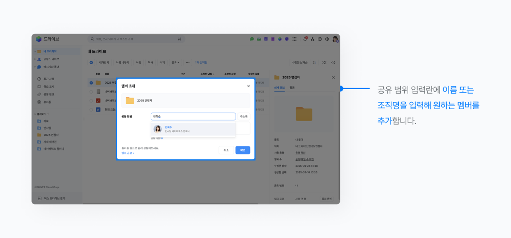 ‘공용 폴더 접근 권한 설정’ 기능을 활용하면 폴더별로 열람 가능한 구성원을 제한하고, 민감한 파일에 대한 접근을 통제할 수 있습니다.