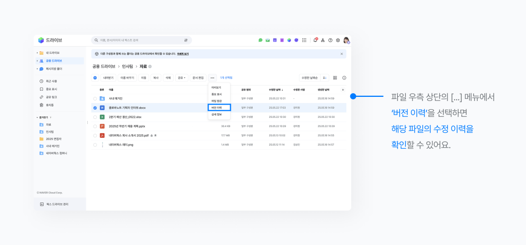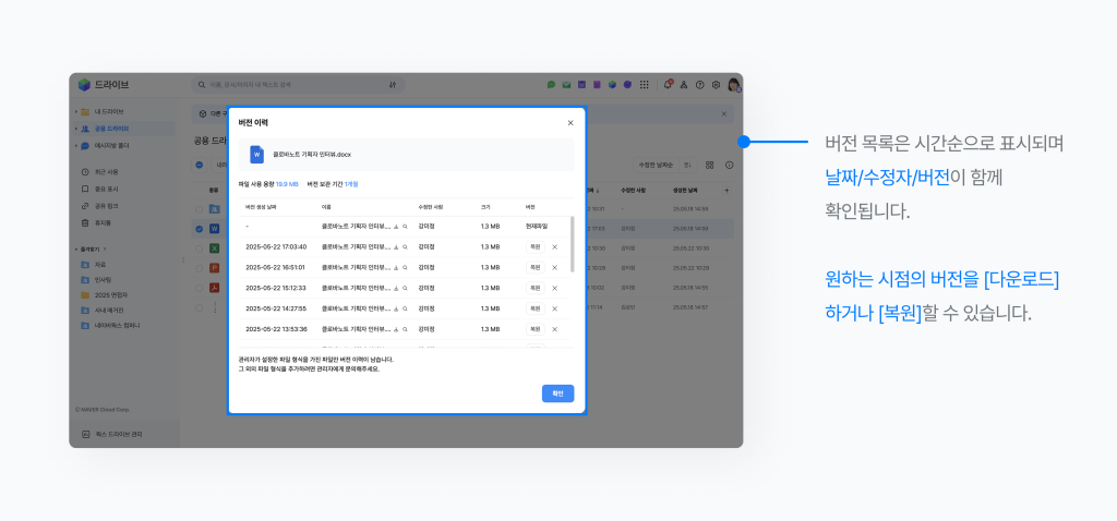 ‘파일 변경 이력 확인 및 복구’ 기능을 사용하면 파일의 이전 버전을 열람하고, 필요할 경우 복원까지 할 수 있어 협업 과정에서의 실수나 오작업에도 유연하게 대응할 수 있습니다.