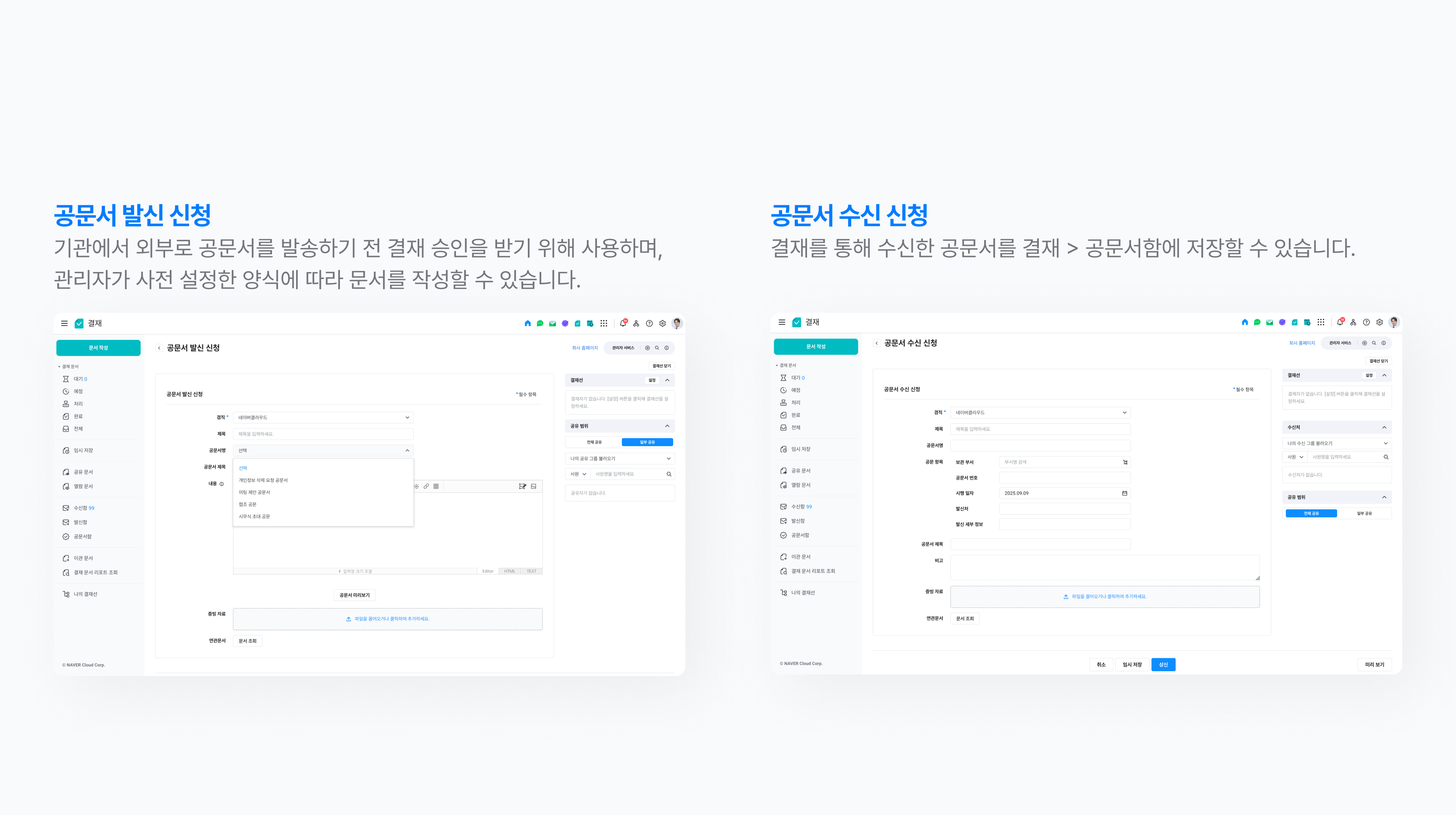 | 수신 대상 | 정부 기관, 금융 기관, 공공기관, 외부 기업/거래처 등 |