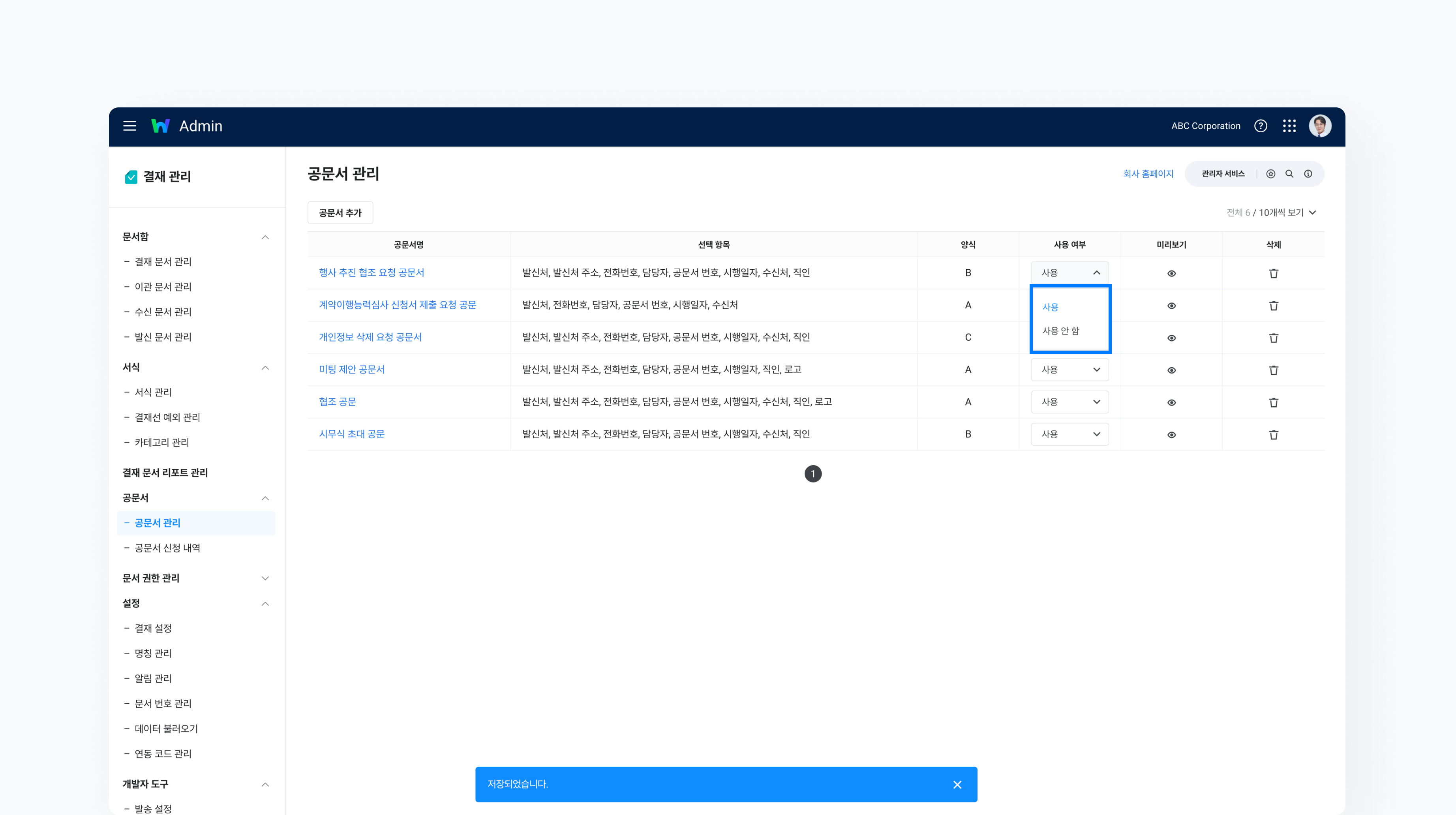 새로운 공문서 양식 설정을 마쳤다면 하단의 ‘저장’을 클릭합니다. 저장된 서식은 Admin > 결재 관리 > 공문서 > 공문서 관리 메뉴의 공문서 목록에서 확인할 수 있습니다.