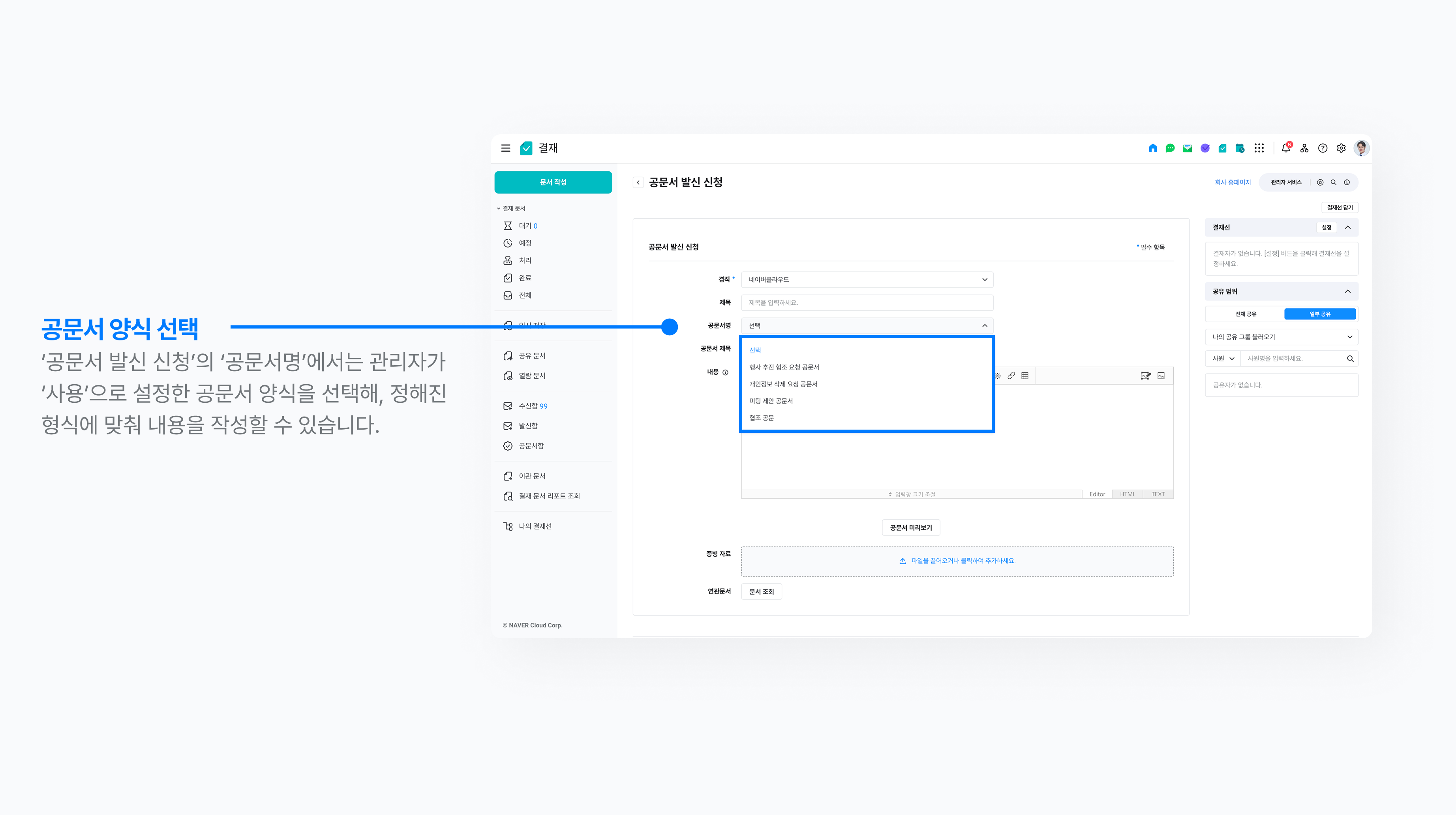관리자는 공문서 작성 시 구성원이 참고 및 활용하는 공문서 양식을 사전에 제작할 수 있는데요. 네이버웍스 화면을 통해 자세히 알아보도록 하겠습니다.