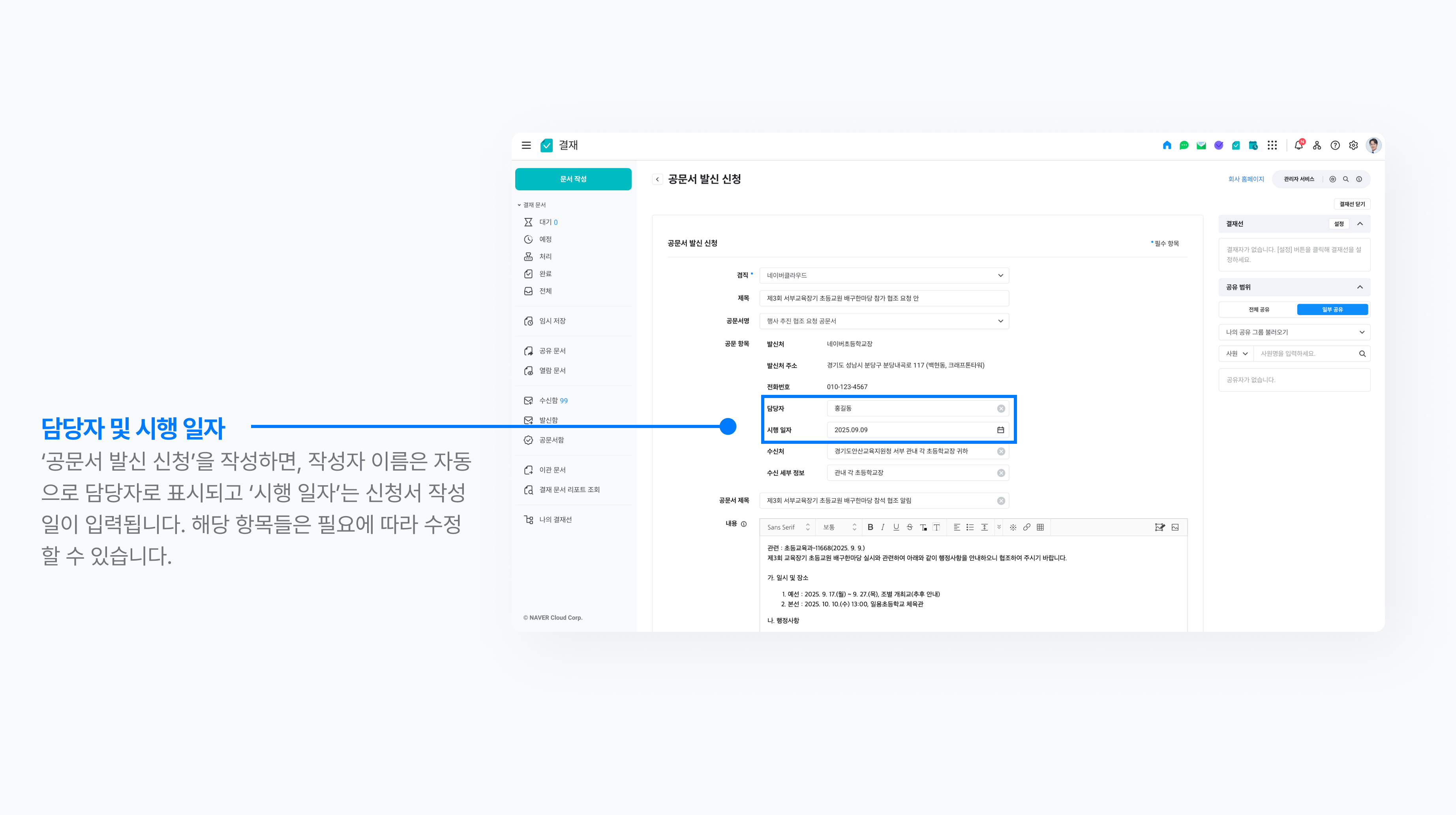 이는 해당 내용의 담당하는 사람이 누구인지 수신자에게 알리기 위한 정보들이죠. 해당 항목들은 수정 가능하며, 최종 공문서에 반영됩니다.