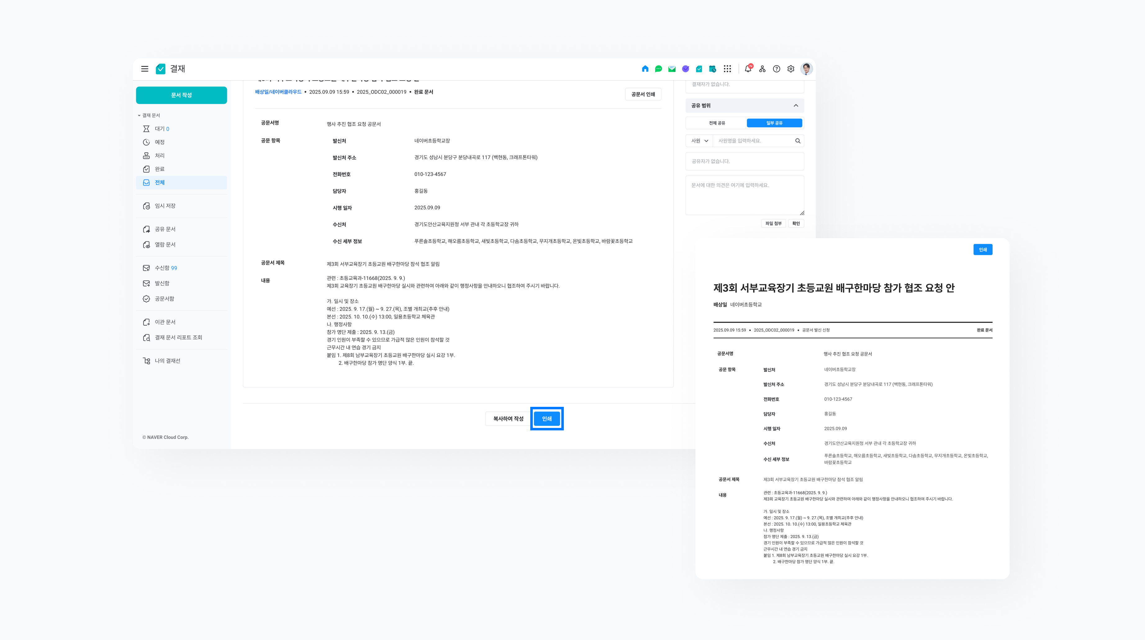 문서 상신 후 결재가 완료되면 문서 우측에 ‘공문서 인쇄’ 버튼이 생성됩니다. 해당 버튼으로 공문서를 다운로드하거나 인쇄하여 배포할 수 있습니다.