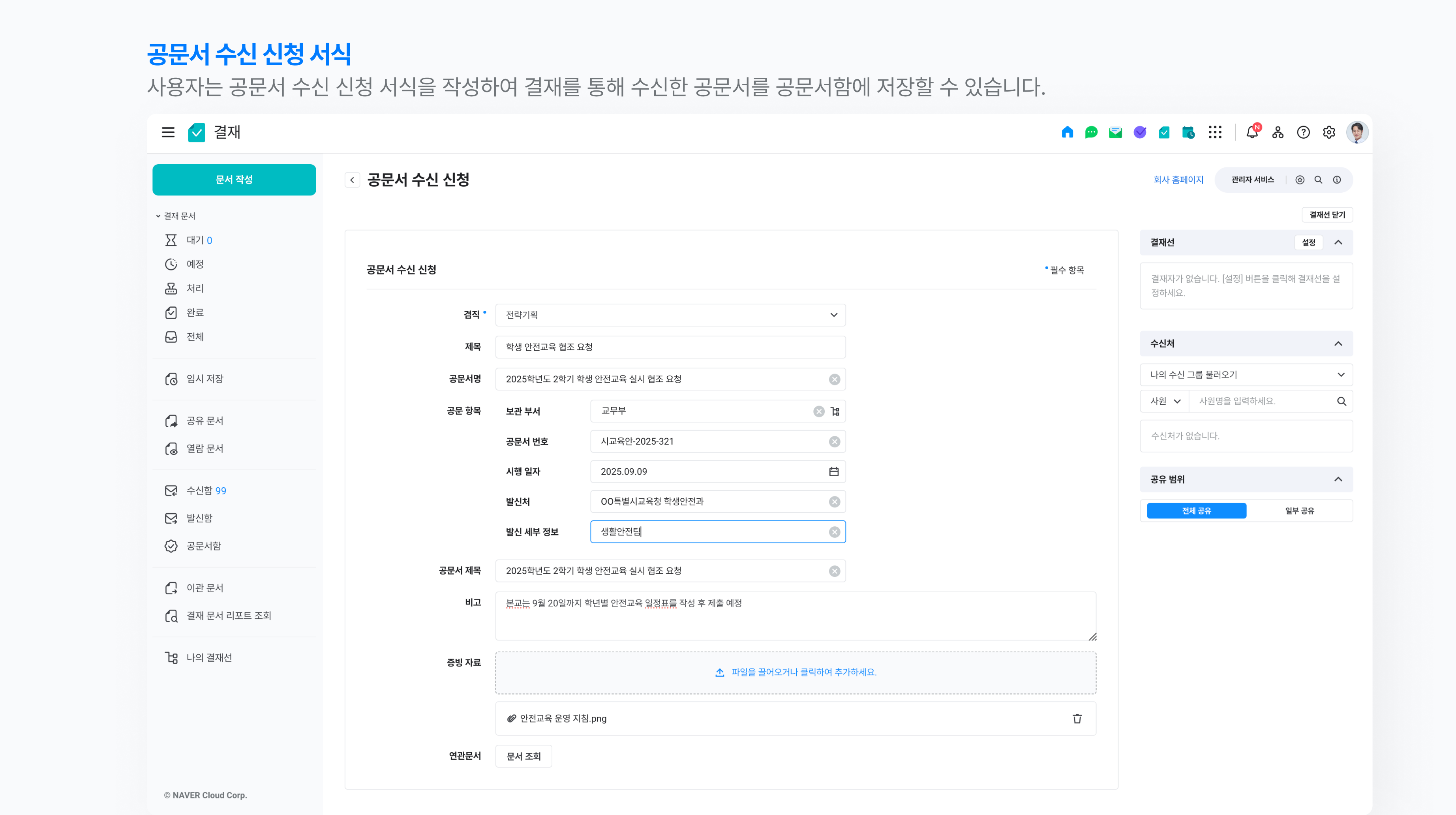 ‘공문서 수신 신청’ 서식을 사용하면 결재를 통해 수신한 공문서를 저장할 수 있습니다.