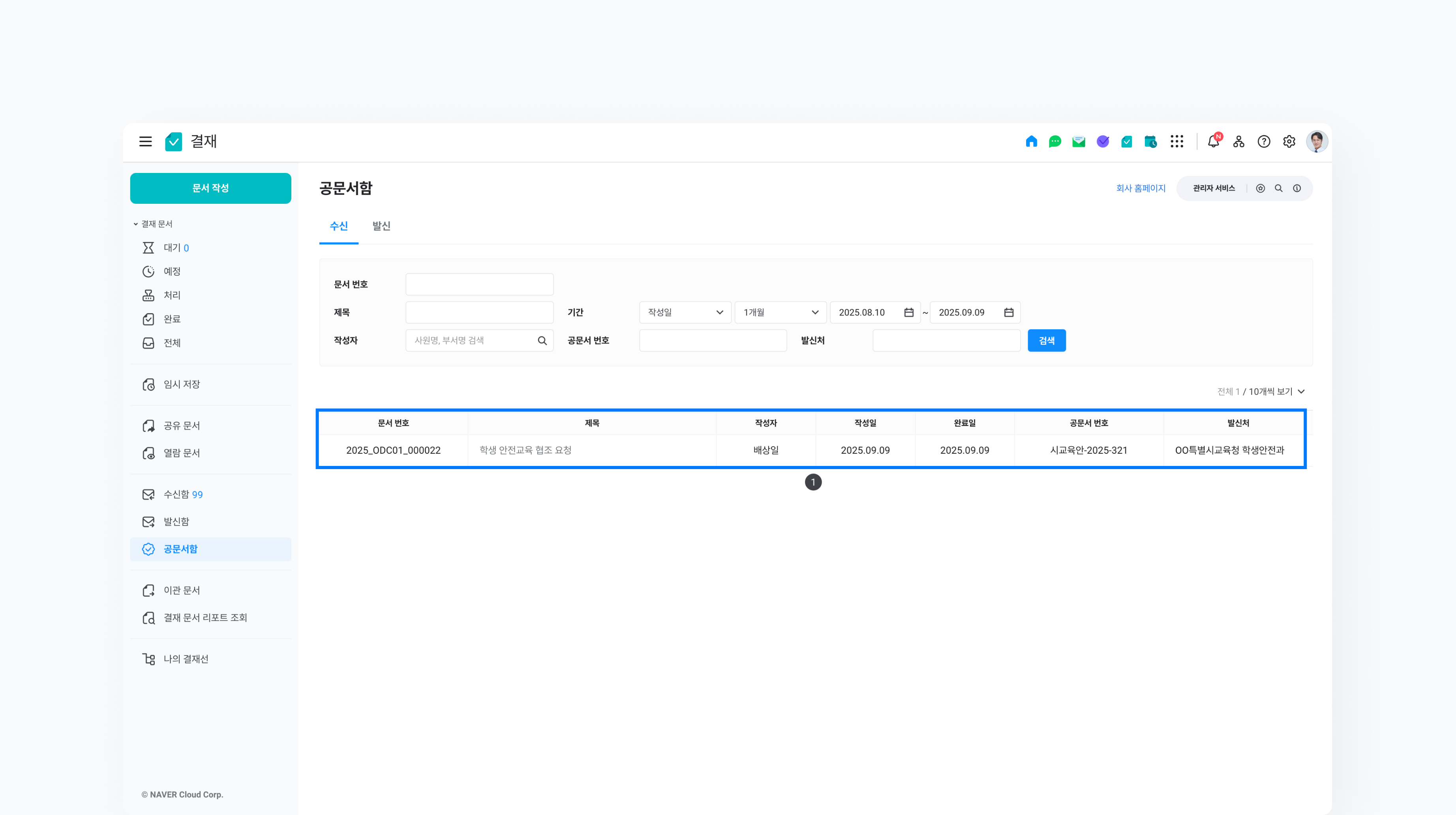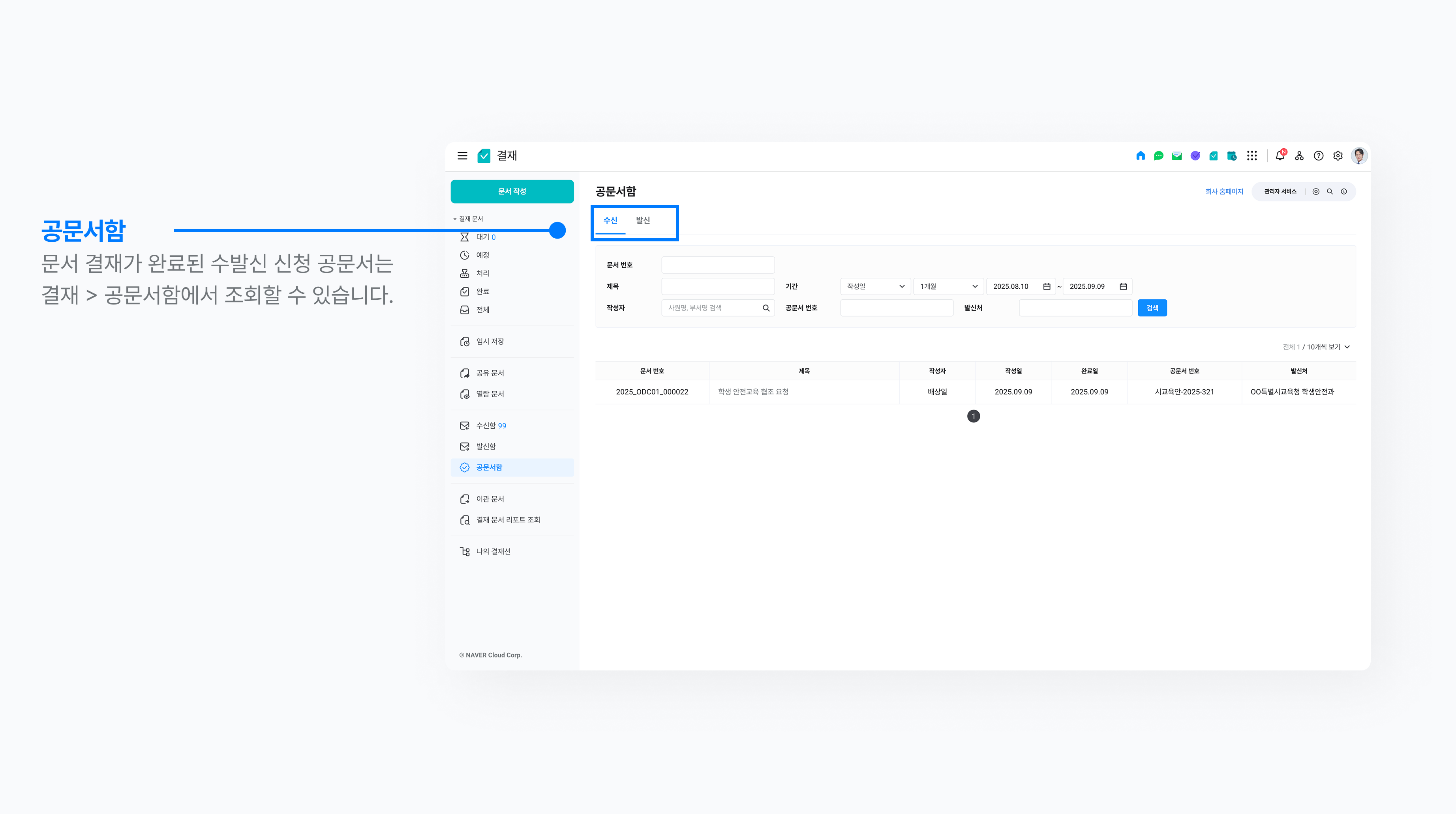 - 결재 완료된 공문서 수·발신 신청 목록은 결재 > 공문서함에서 확인할 수 있습니다.