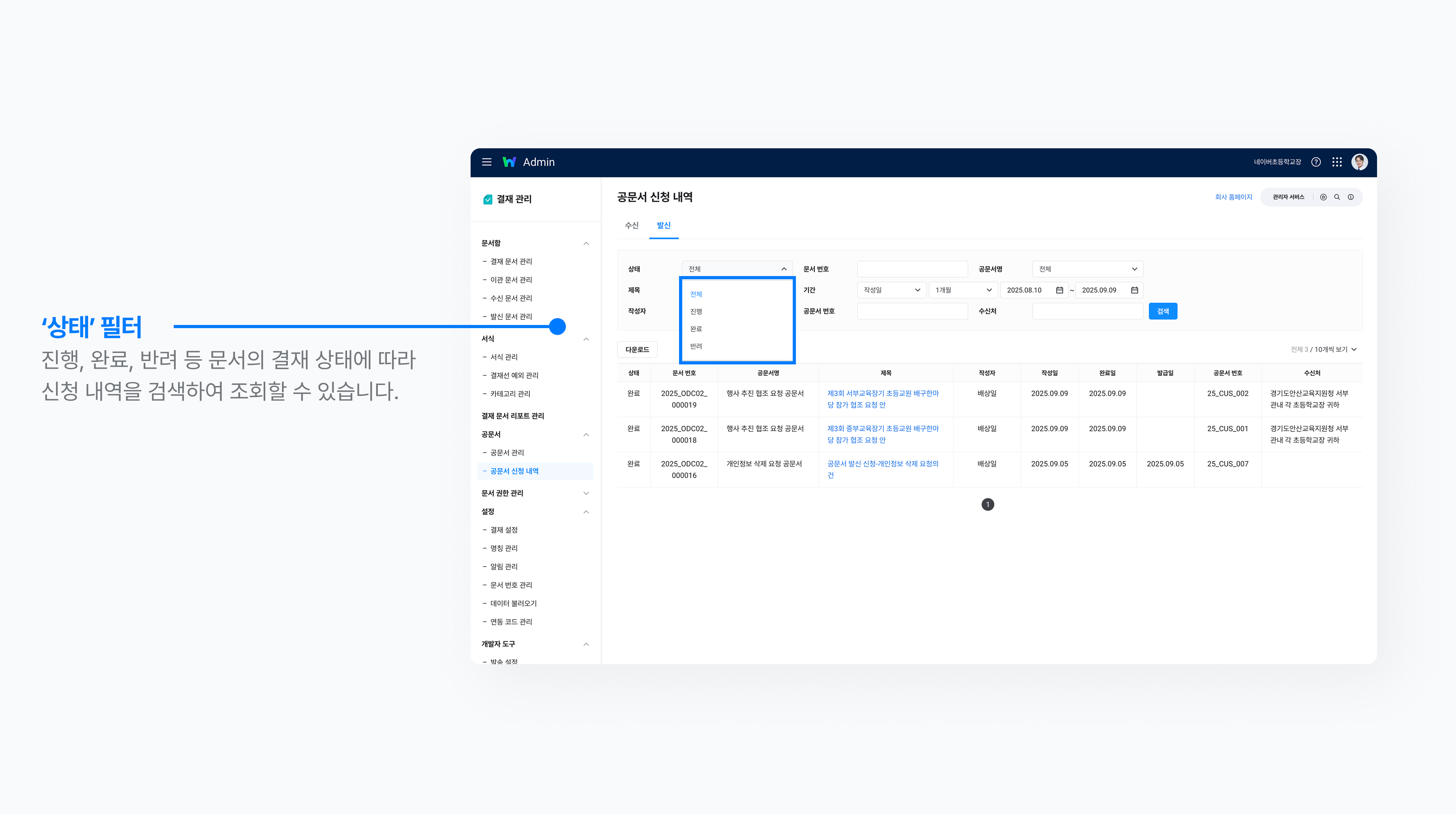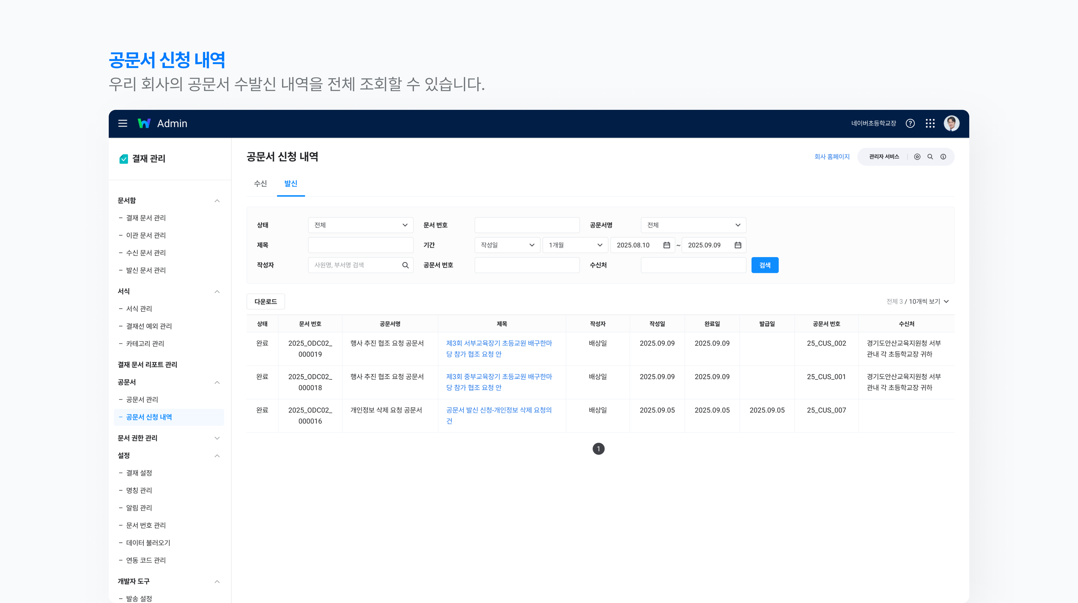 - 관리자는 Admin > 결재 관리 > 공문서 > 공문서 신청 내역 메뉴를 활용하여 우리 조직의 전체 공문서 수·발신 신청 내역을 조회하거나 다운로드할 수 있습니다.