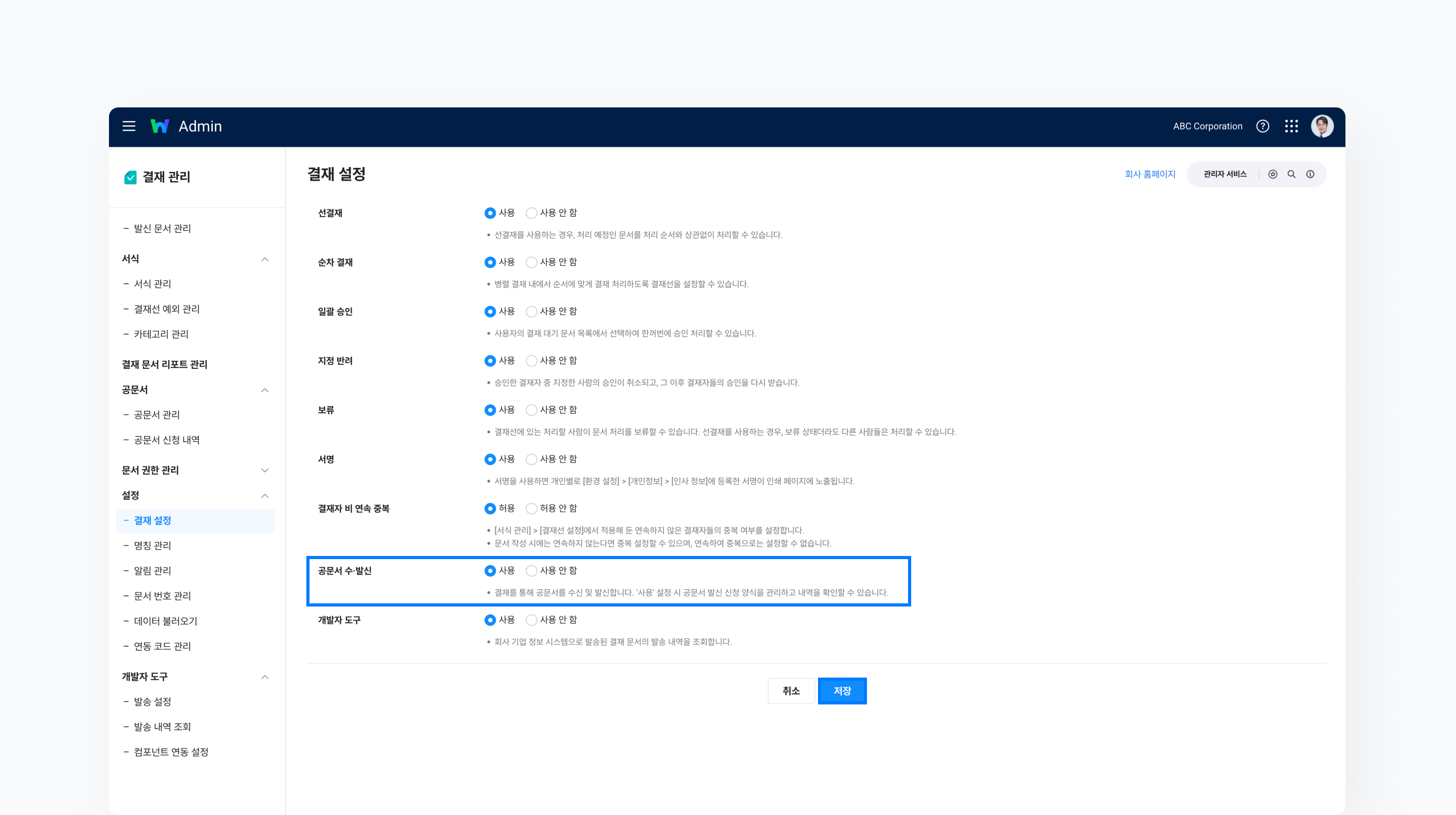 결재를 통해 공문서를 수신 및 발신하기 위해서는 Admin > 결재 관리 > 설정 > 결재 설정 메뉴로 이동합니다. ‘공문서 수·발신’ 항목을 ‘사용’으로 설정한 후 ‘저장’을 클릭합니다. 설정이 완료되면 공문서 양식을 관리하고, 수·발신 신청 내역 또한 조회할 수 있습니다.