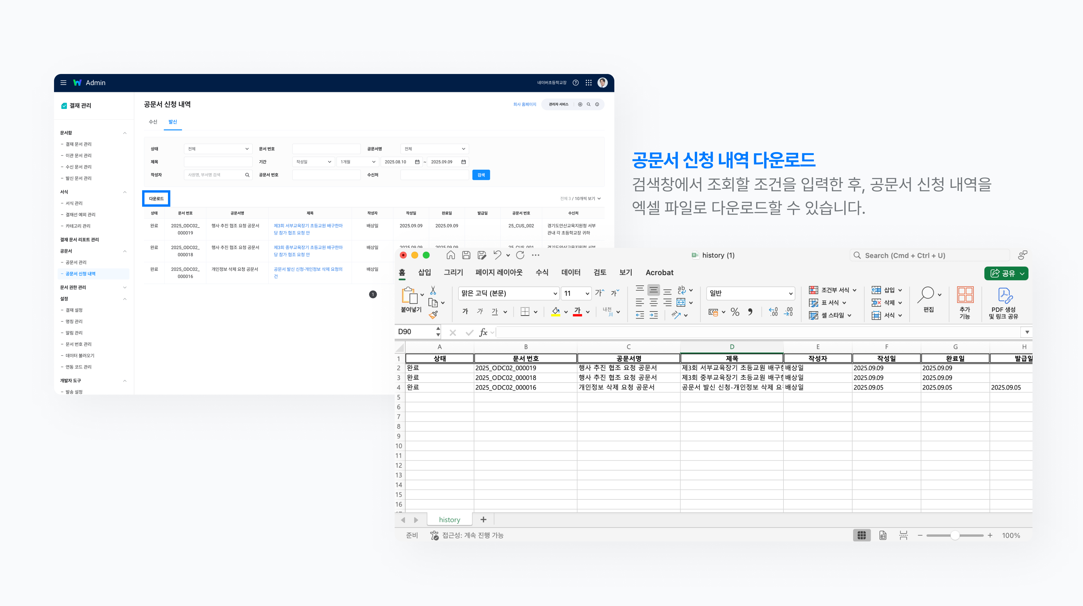 관리자는 우리 조직의 전체 공문서 수·발신 신청 내역을 조회할 수 있으며, 신청 목록을 엑셀 파일로 다운로드할 수 있습니다.