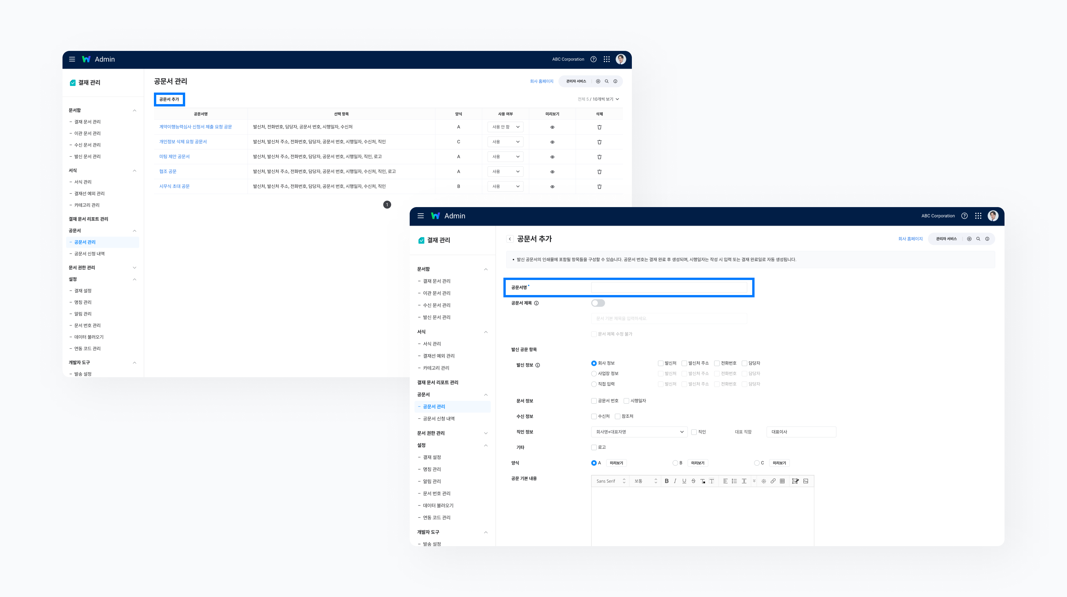 먼저 Admin > 결재 관리 > 공문서 > 공문서 관리 메뉴에서 ‘공문서 추가’ 버튼을 눌러 새 양식을 추가합니다. 화면 상단에는 ‘공문서명’과 ‘공문서 제목’ 항목을 확인할 수 있습니다. ‘공문서명’은 공문서 양식을 구분하기 위한 식별자입니다. 구성원은 ‘공문서 발신 신청’ 서식에서 관리자가 설정해둔 ‘공문서명’을 선택해 원하는 양식을 불러올 수 있습니다.