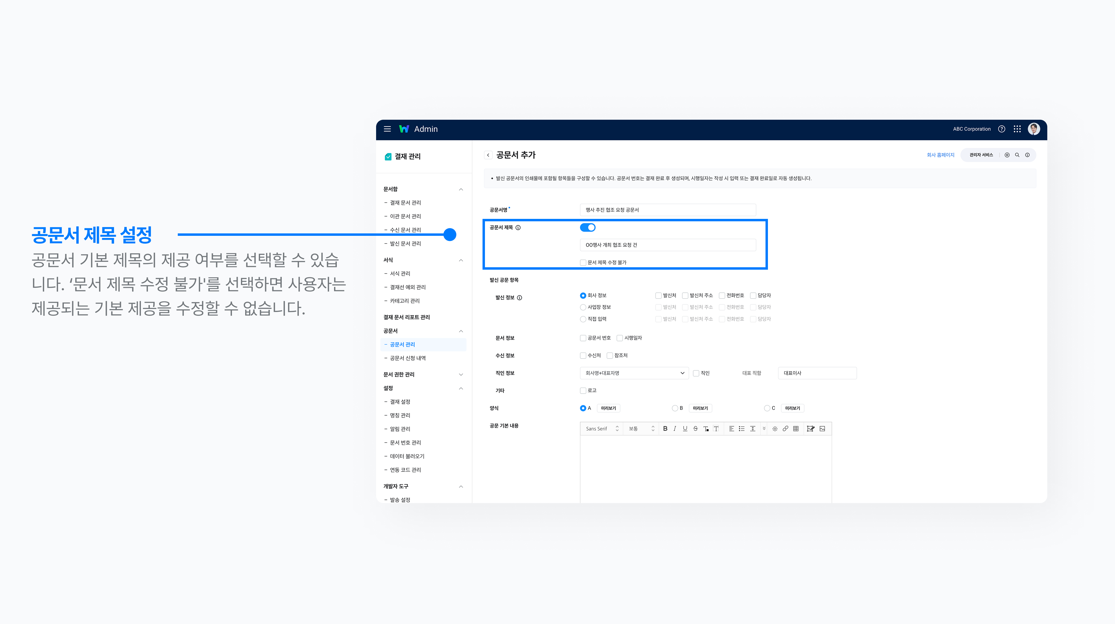 반면 ‘공문서 제목’은 실제 문서 작성 시 수신자에게 기본으로 표시될 제목을 사전에 정해두는 항목입니다. 이때, ‘문서 제목 수정 불가’를 클릭하면 관리자가 사전 설정한 제목이 고정되어 작성자가 수정할 수 없습니다.