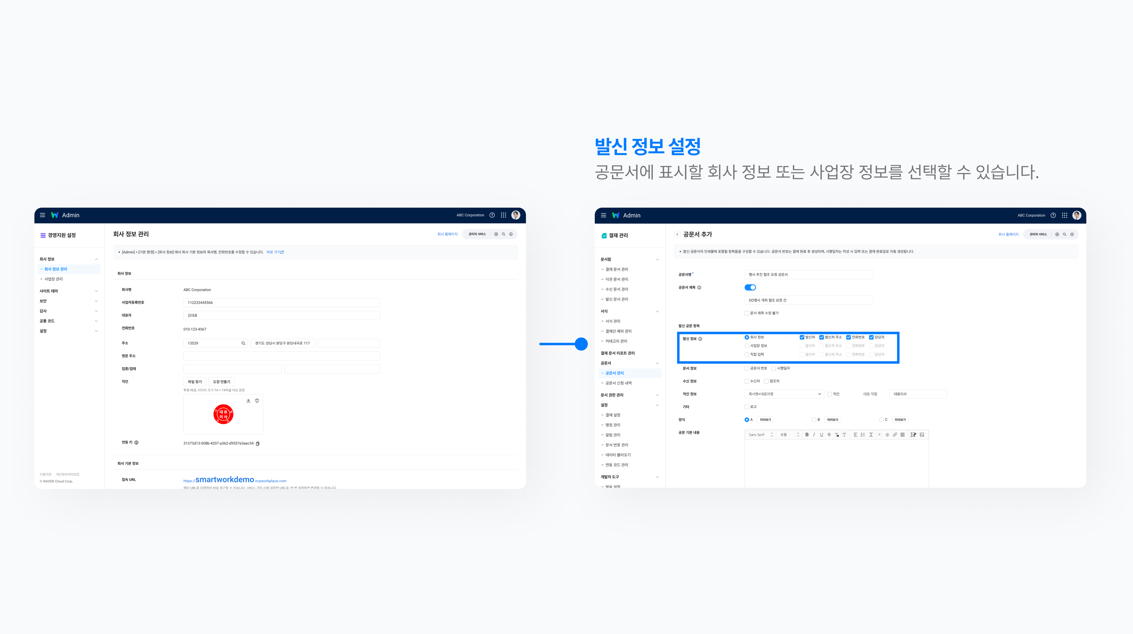 ‘발신 공문 항목’에서는 공문서에 표시할 항목들을 클릭해 추가할 수 있습니다. 우선 ‘발신 정보’는 ‘회사 정보’, ‘사업자 정보’, ‘직접 입력’ 중에서 하나를 선택하며, 선택한 정보가 공문서 상단에 기본값으로 표시됩니다.