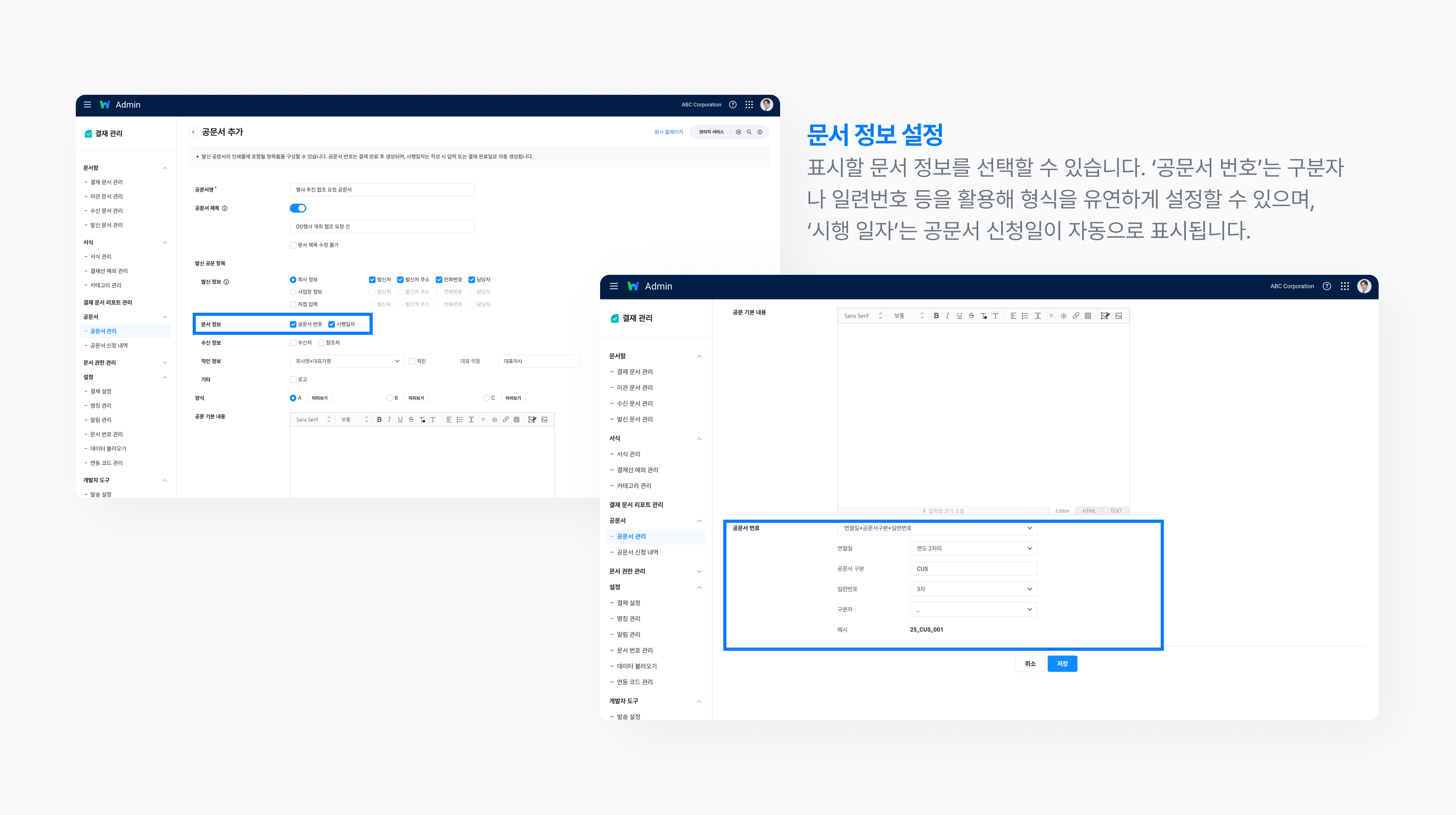 ‘문서 정보’에서는 ‘공문서 번호’와 ‘시행일자’ 항목을 추가할 수 있는데요. ‘공문서 번호’는 화면 하단의 ‘공문서 번호’ 설정에 따라 결재 완료 시 문서에 자동 표시됩니다. ‘시행일자’는 공문서 신청일을 기준으로 자동 입력되며, 필요하면 작성자가 수정할 수 있습니다.