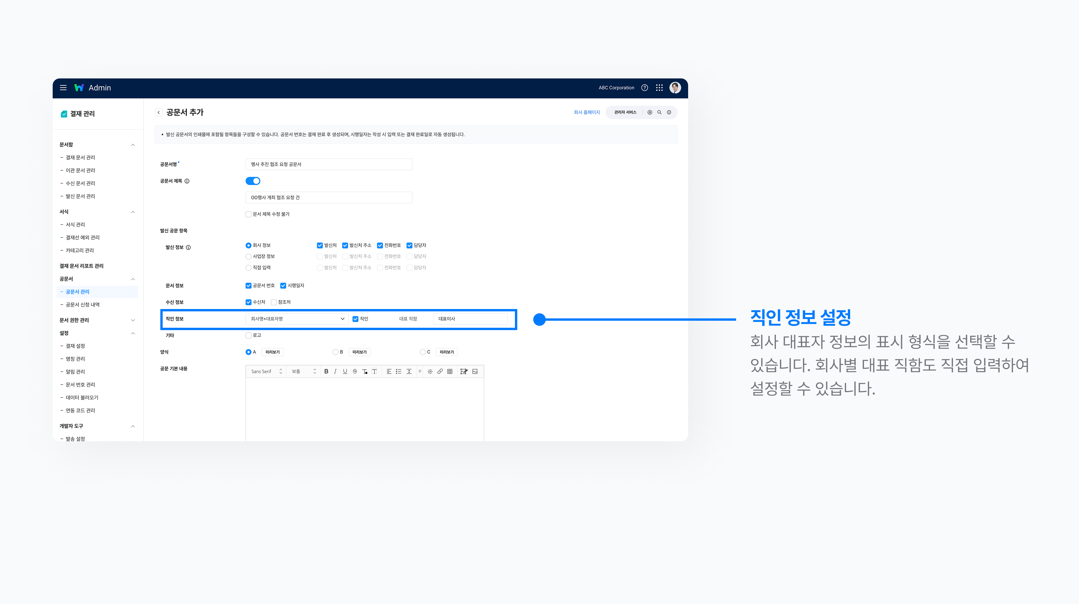 공문서는 공식 문서이기 때문에 신뢰성을 담보할 직인이 필요하죠. 따라서 ‘직인 정보’ 항목에서는 대표자 정보의 표시 형식을 선택할 수 있습니다. 이때 경영지원 설정 > 회사 정보 > 회사 정보 관리에 직인을 등록해 두었다면 ‘직인’을 선택해 대표자 이름 옆에 삽입할 수 있습니다.