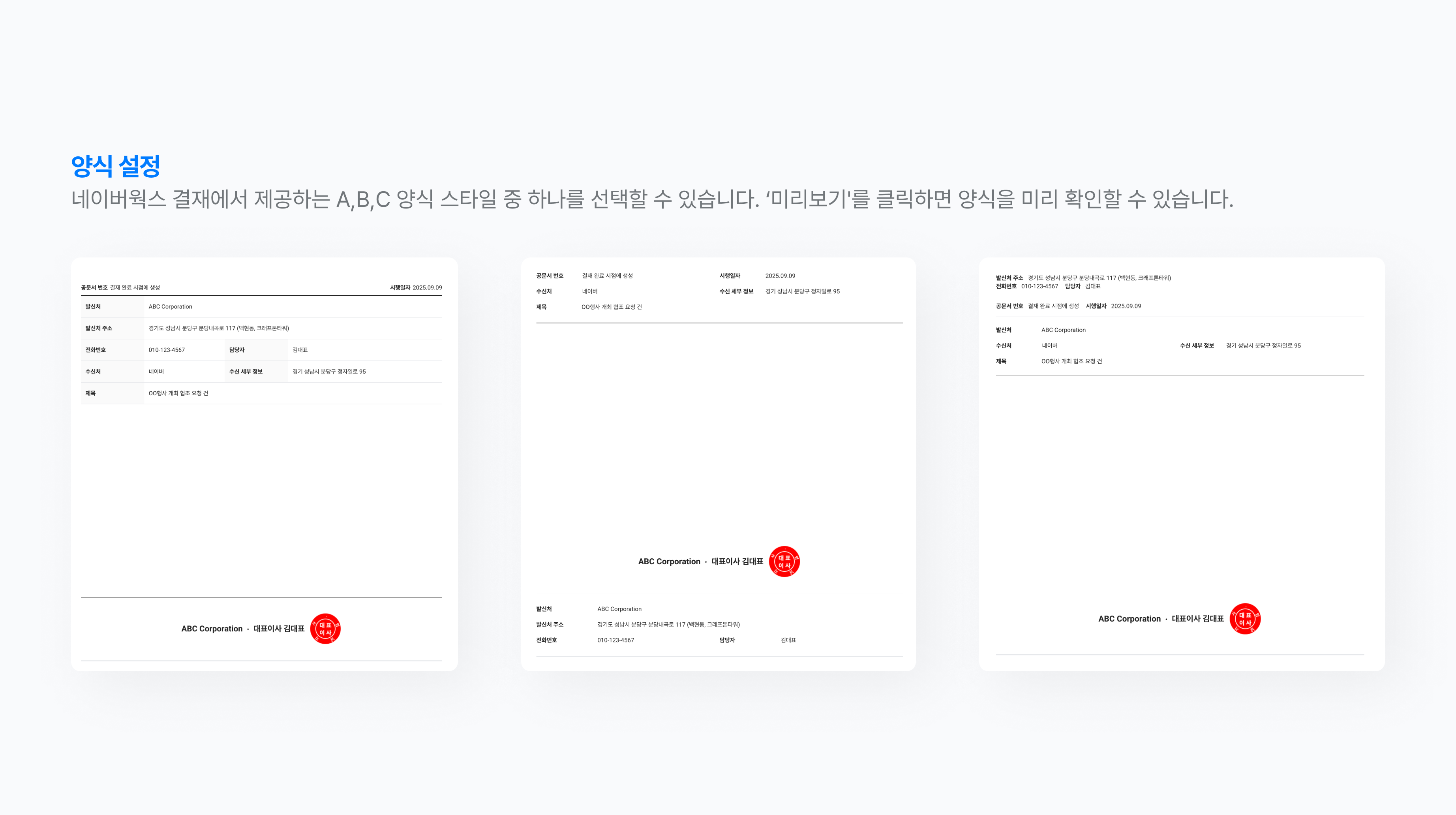 ‘양식’에서는 지금까지 설정한 항목들을 조합해 완성될 공문서의 스타일을 선택할 수 있습니다. 네이버웍스 결재는 A, B, C 세 가지 양식을 제공하며, 각 양식의 우측 ‘미리보기’를 클릭하면 추가한 항목이 반영된 예시를 확인할 수 있습니다. 우리 회사에 가장 적합한 공문서 양식을 선택해 보세요.