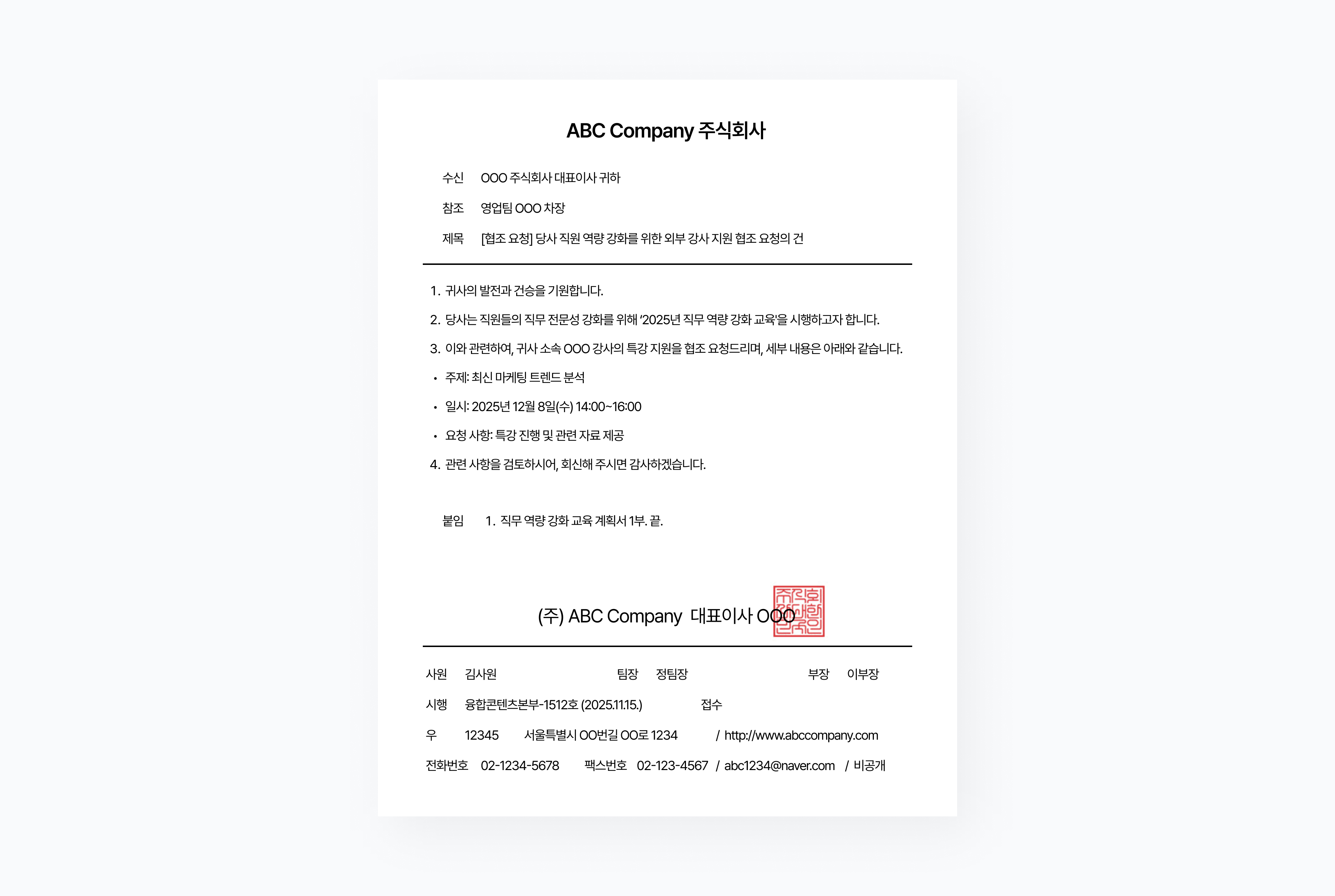 | 발신 명의 | (주) ABC Company 대표 이사 OOO [직인/서명] | 대표이사 명의 발신이 원칙이며, 회사 직인을 반드시
