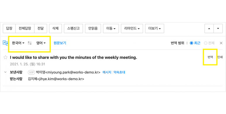 번역 언어를 변경하려면 왼쪽 상단의 언어를 클릭해 변경합니다. 메일 내용 전체를 번역하고 싶을 경우, 오른쪽 상단의 ‘번역 범위’에서 ‘전체’를 선택하여 번역 범위를 변경합니다.