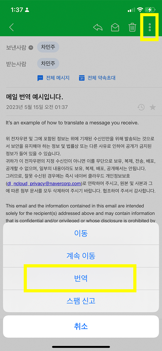 메일을 열고 화면 오른쪽 상단의 ‘번역’을 클릭합니다.