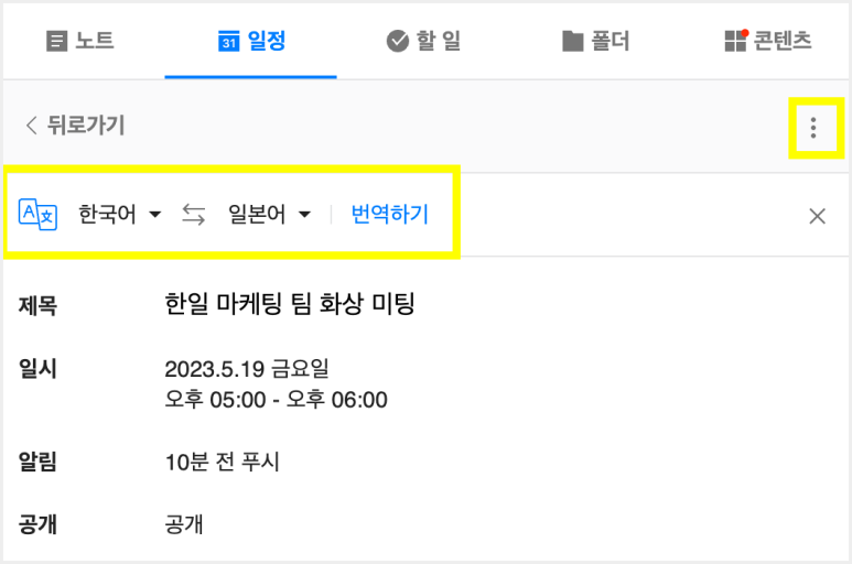 번역은 메일, 게시판, 캘린더, 설문, 할일에까지 적용됩니다.
