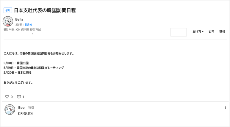 ‘게시글 번역’을 이용하면 해외 법인/외국인 동료가 작성한 게시글과 댓글을 번역해 이해할 수 있으며, ‘일정 번역’을 이용해 외국인 동료가 공유한 일정도 나의 언어로 확인할 수 있답니다. 노트, 설문, 메일 번역이 가능한 것은 당연지사!