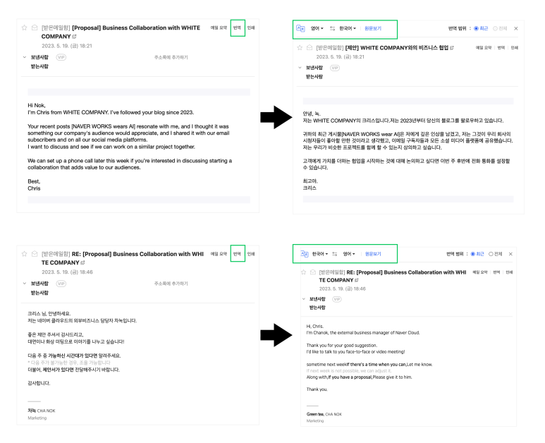 네이버웍스에 적용된 파파고 번역 기능을 사용하면, 메일창에서 바로 영어→한국어로 번역된 내용을 읽을 수 있습니다. 또한 한국말로 답장을 해도 상대방이 본인의 언어로 바로 번역해서 이해를 할 수 있죠.