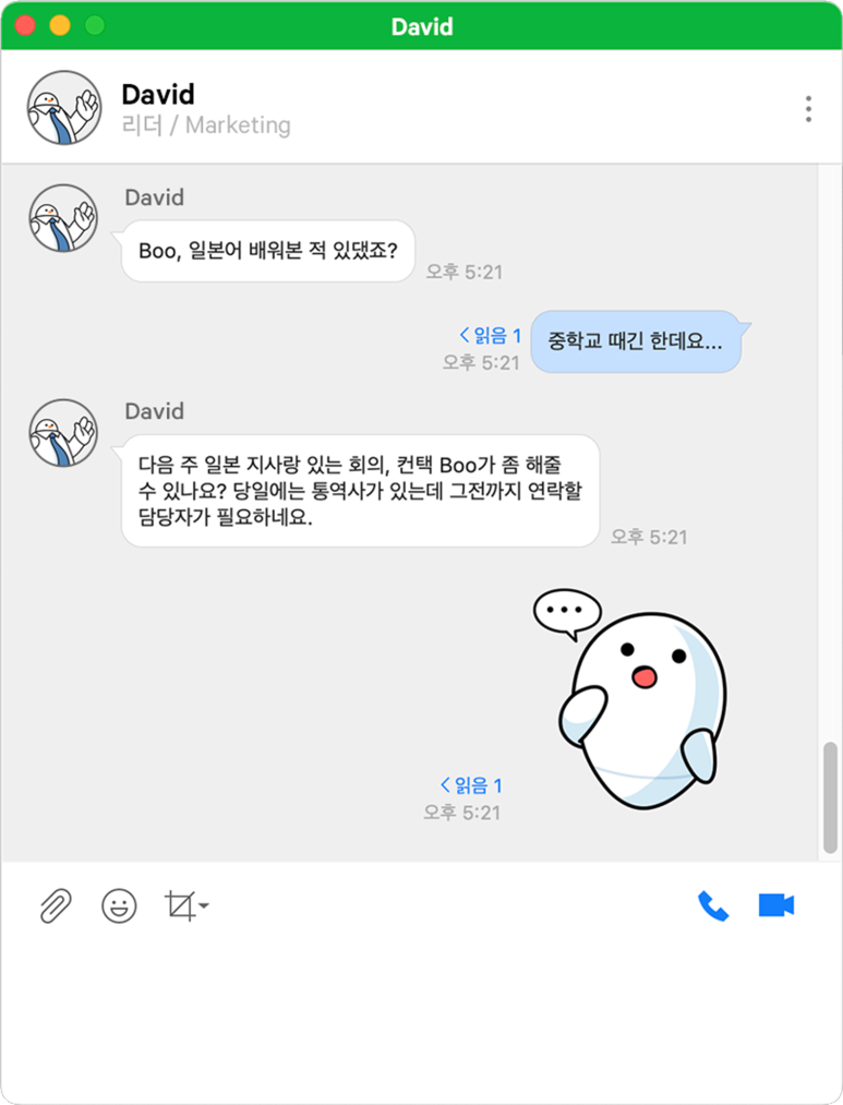 잠깐, 일본인 동료와 메신저방에 프랑스인 동료까지 끼면 어떻게 되냐구요? 메시지의 ‘자동 통역’ 기능을 설정하면 내가 설정한 통역 언어를 기준으로 3개 이상의 언어도 모-두 자동 통역되니 걱정하지 마세요!