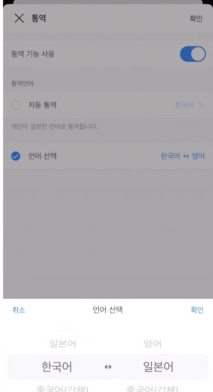 - ‘통역 기능 사용’을 켜고 ‘자동 통역’을 선택하거나 통역 언어를 직접 선택합니다.