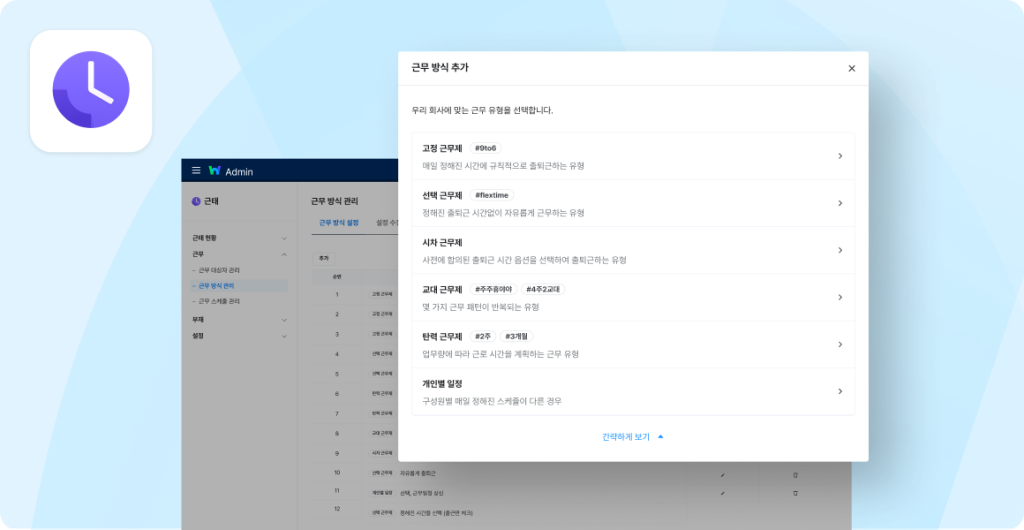 - 근무 방식 관리에서 업무 시간을 설정하여 지각과 조퇴도 빠짐없이 기록할 수 있어요