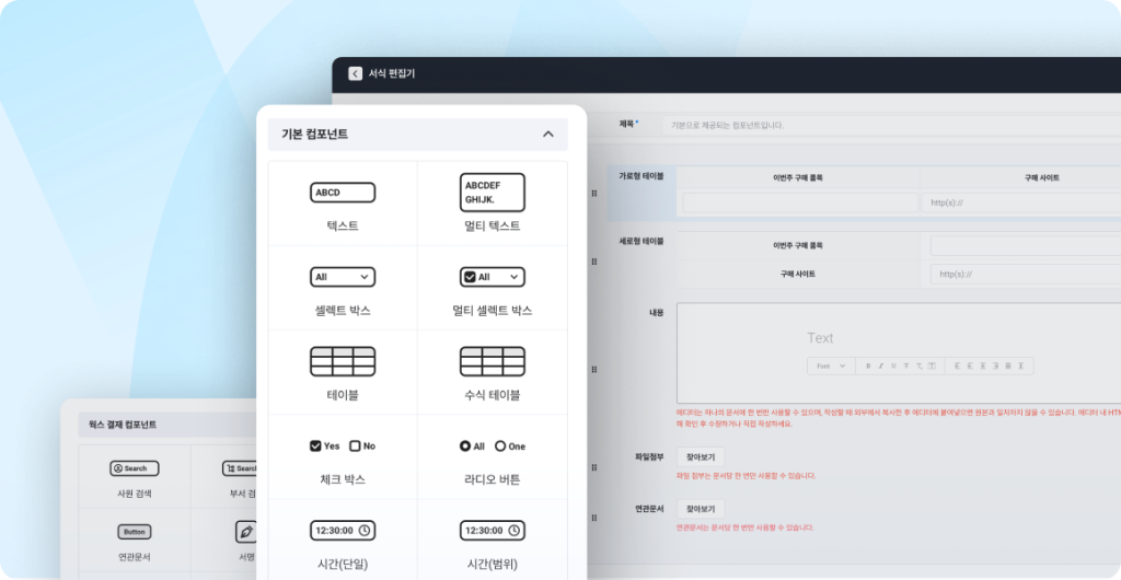 - 결재 문서에 필요한 다양한 컴포넌트들로 누구나 뚝 – 딱 만들 수 있어요.