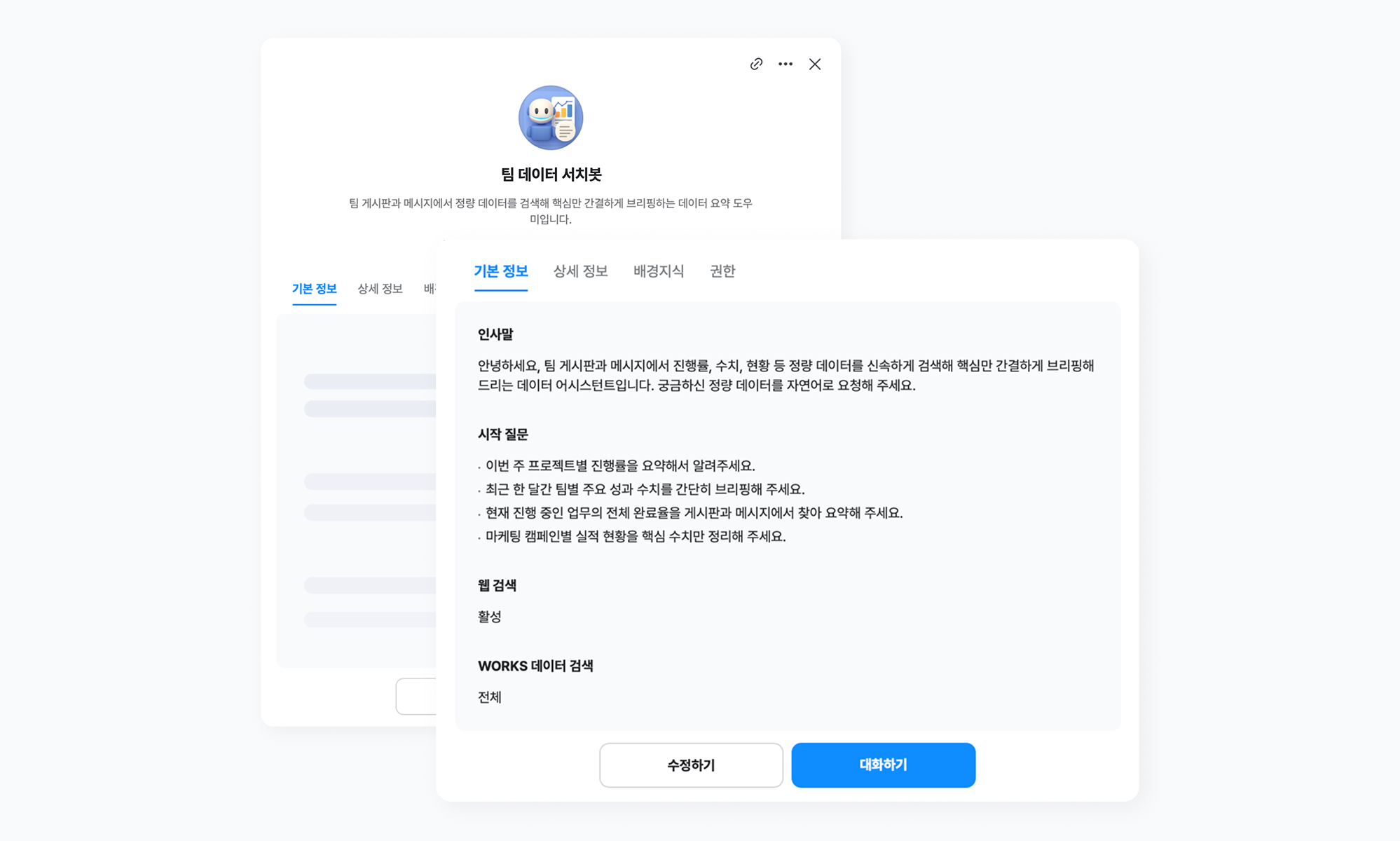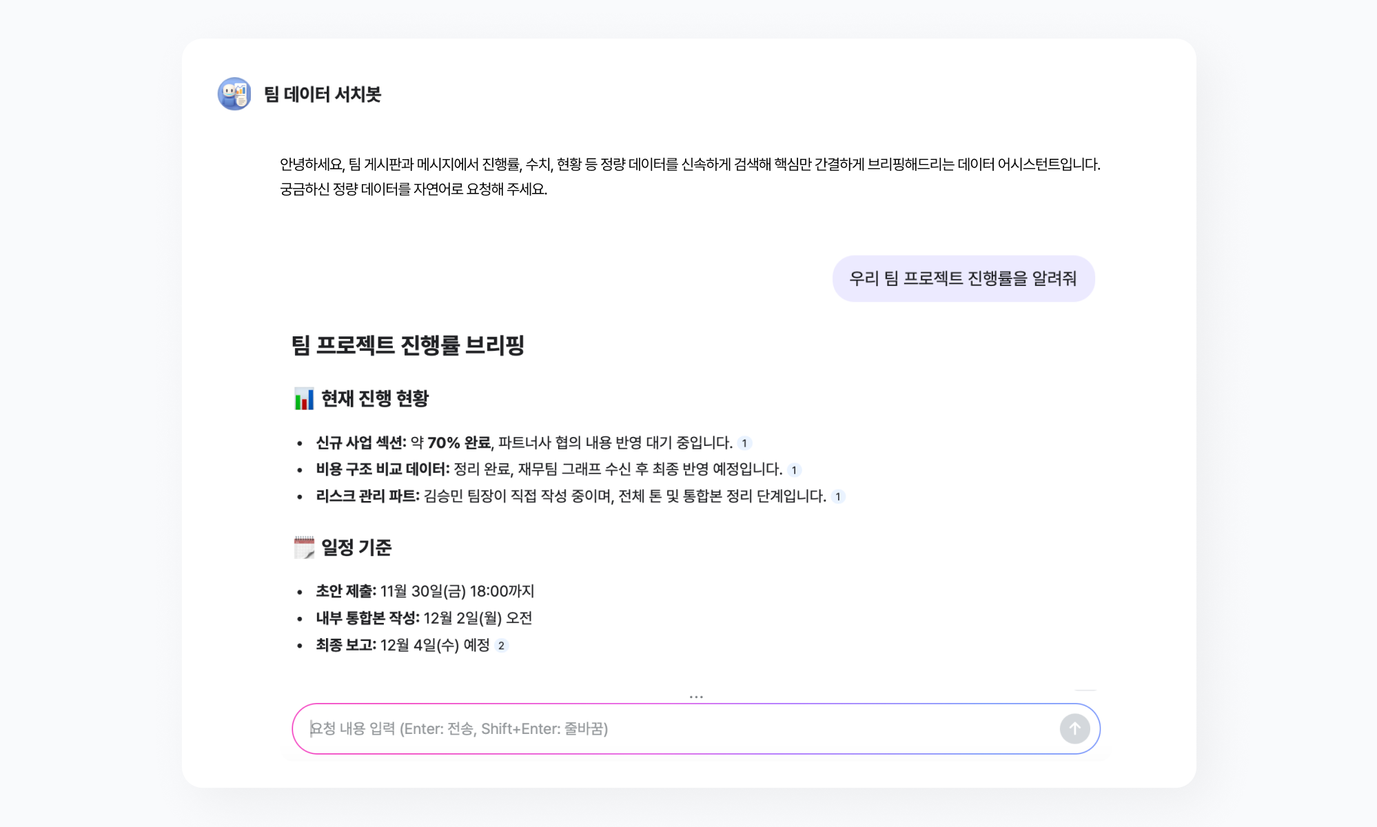 팀 게시판과 메시지 내의 진행률, 수치, 현황 등 정량 데이터를 검색해 핵심만 간결하게 브리핑하는 데이터 요약 도우미