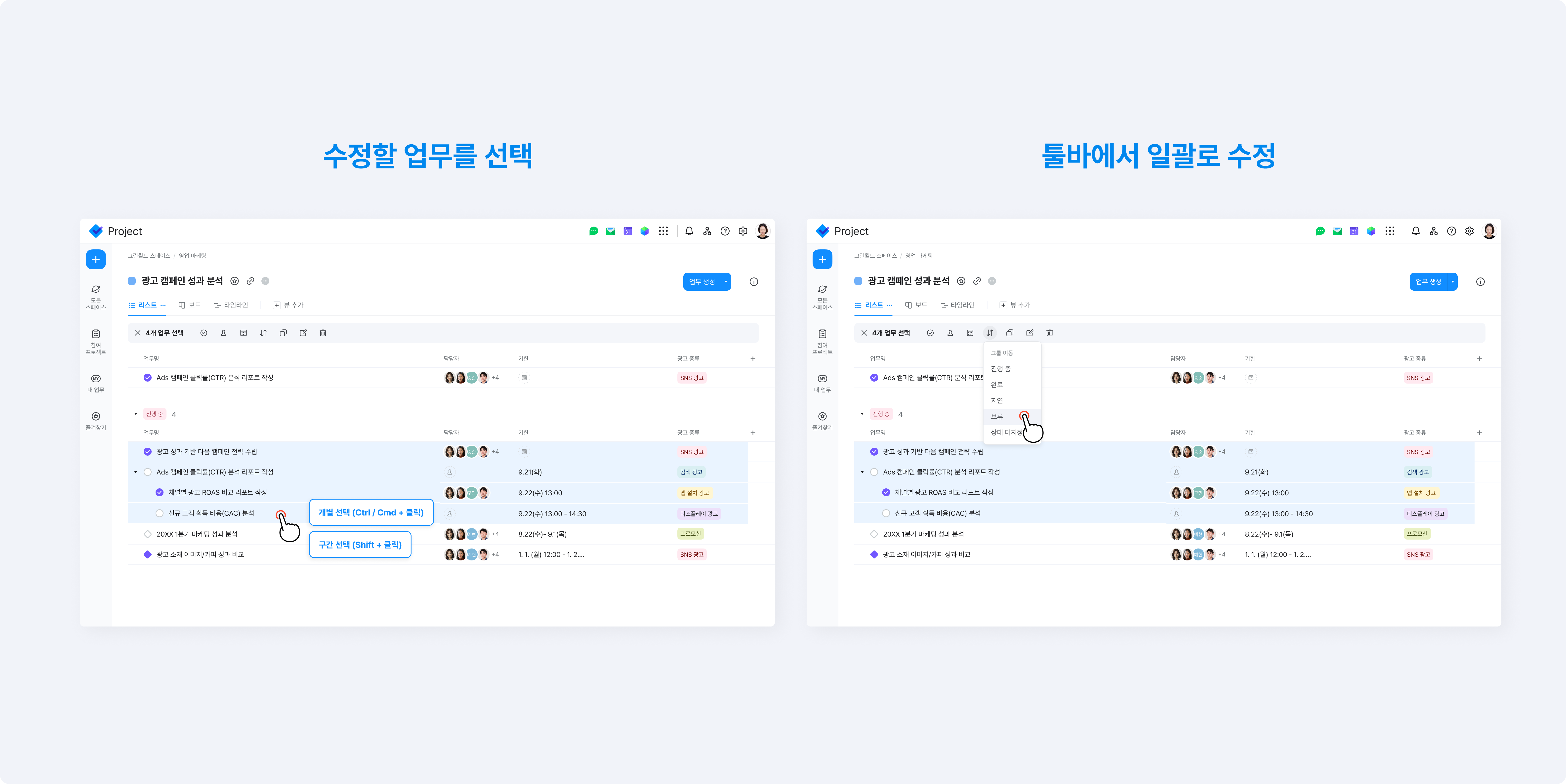 - 여러 업무를 한 번에 선택해 상태, 담당자, 기한 등을 일괄 변경할 수 있고,