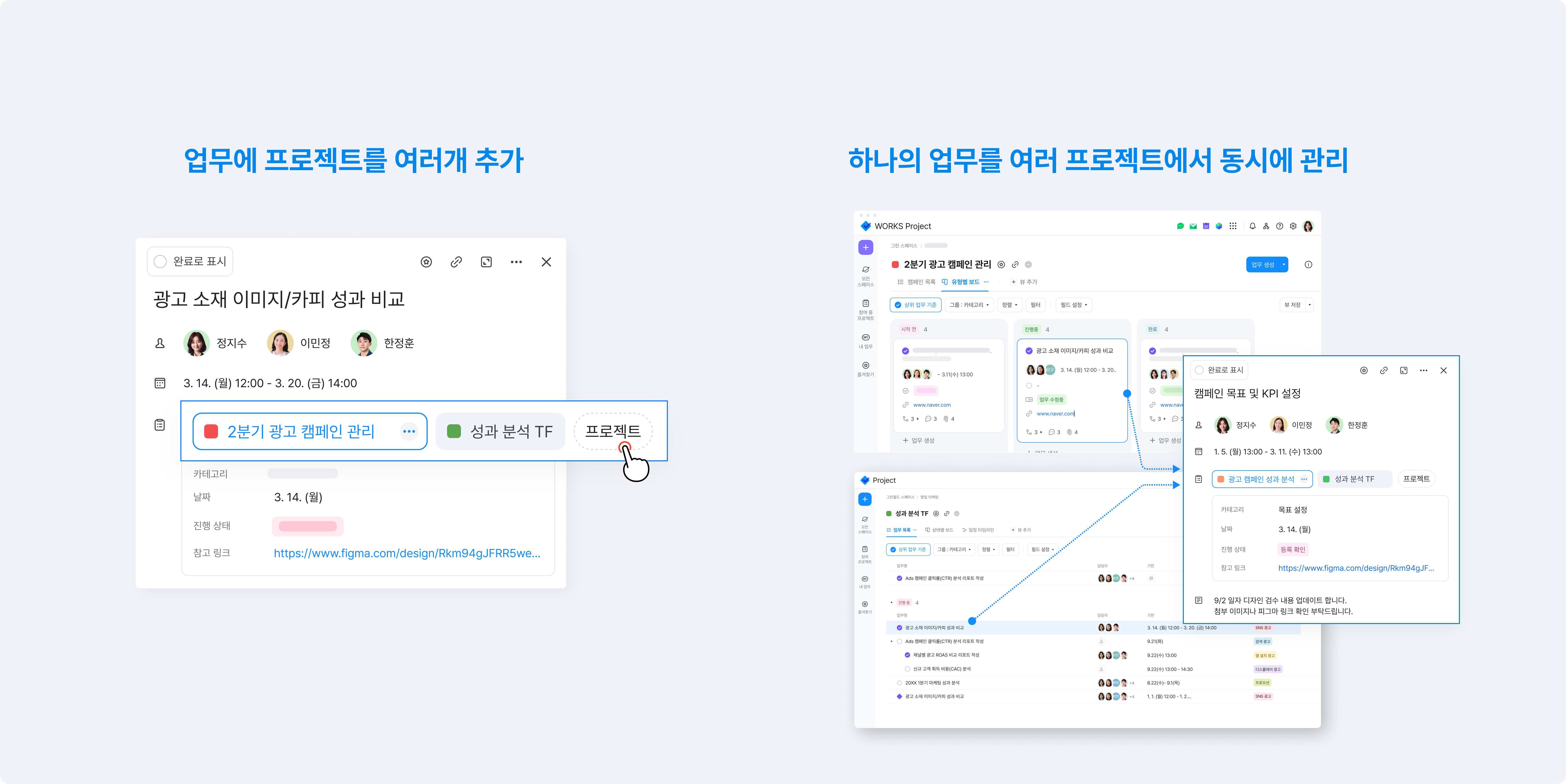 TIP 부서 간 협업 업무나 여러 팀이 함께 보는 업무에 특히 유용해요. 하나의 업무를 여러 프로젝트에서 동시에 관리할 수 있습니다.