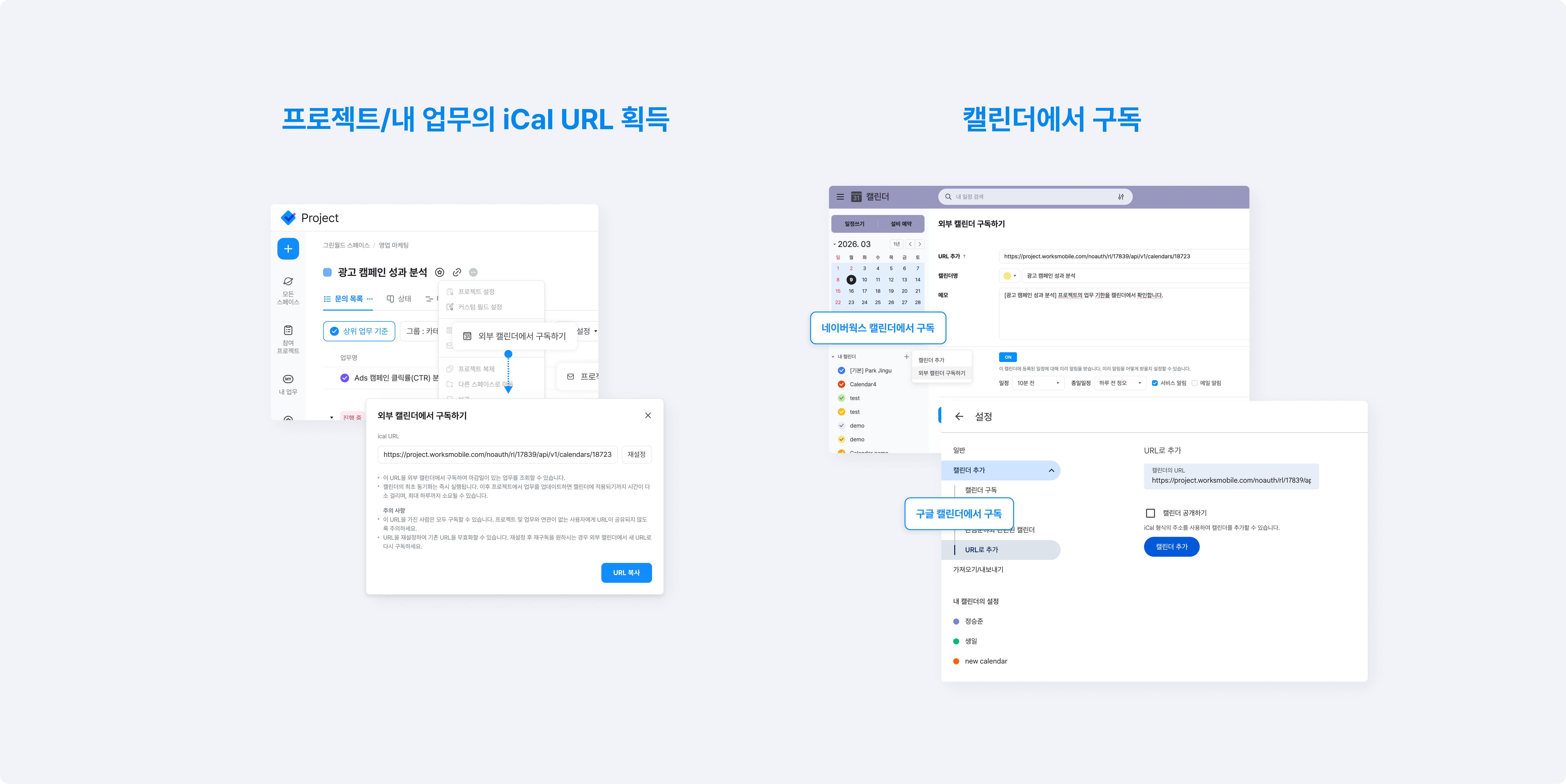‘외부 캘린더에서 구독하기’를 선택하면 구독용 URL(iCal 주소)이 생성됩니다.- 이 URL을 복사해 네이버웍스 캘린더, Google 캘린더, Apple 캘린더 등 사용 중인 캘린더 서비스에 구독 URL로 추가합니다.