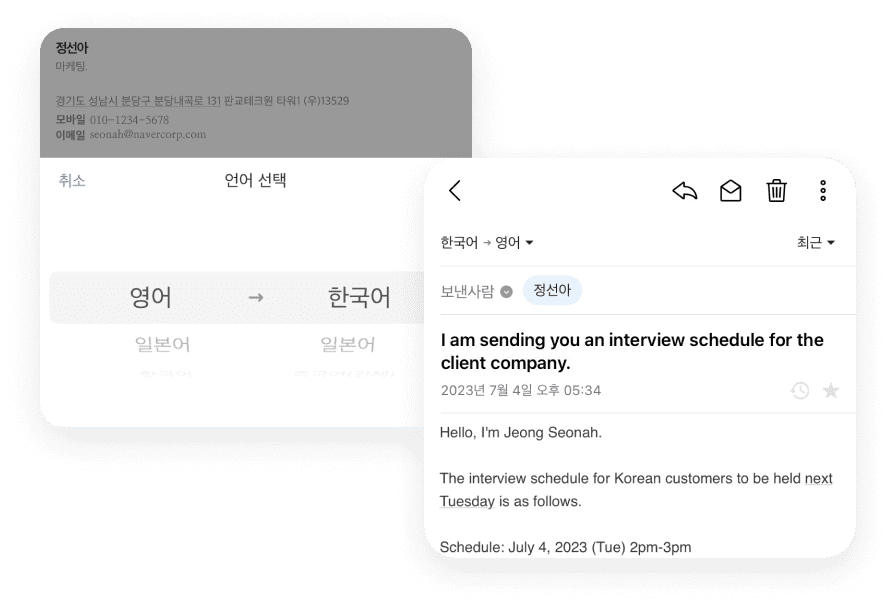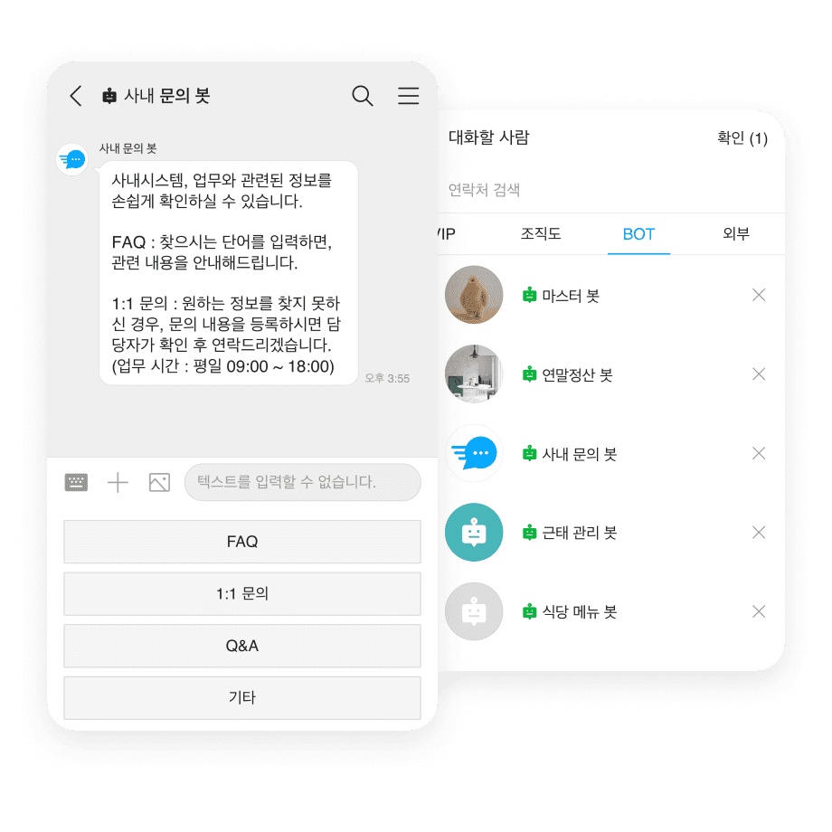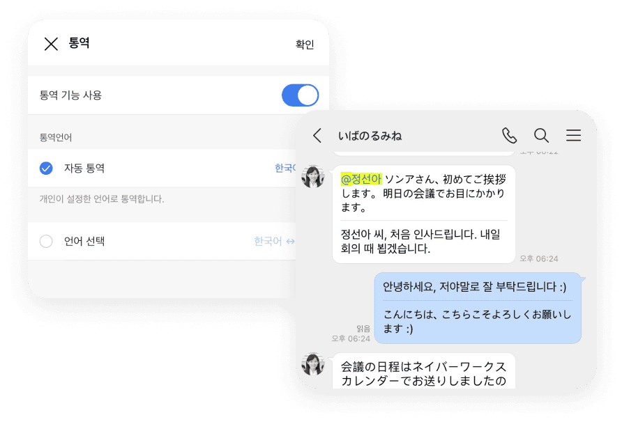 AI 기술과 Bot으로 업무 생산성을 높여주는 네이버웍스 AI 기술과 Bot으로 업무 생산성을 높여주는네이버웍스 무료로 시작하기 네이버웍스에 적용된 네이버의 최신 AI기술과 Bot을 활용하여구성원의 잠재력을 깨우고 생산성을 극대화해보세요. 네이버웍스 x AI 번역기 파파고 언어 장벽 없이 업무하는 세상 많은 시간과 비용이 드는 어학 공부 없이도 외국인 동료와 자유롭게 소통하는 글로벌 인재가 될 수 있습니다. 파파고 AI 기술별도 번역창 없이도 네이버웍스에서 실시간 다국어 통번역 10개 언어 지원영어, 일본어, 중국어 (간·번체), 프랑스어, 스페인어, 포루투갈어, 베트남어, 태국어, 인도네시아 지원 6개 서비스에서 활용네이버웍스 메일 · 메시지 · 캘린더 · 할 일 · 설문 · 게시판에서 통번역 기능 활용 · 네이버 자체 기술로 만들어진 파파고(Papago)는 인공신경망 기반 기계 번역 기술을 적용, AI가 데이터 학습을 통해 문장 단위로 언어를 번역하여 정확하고 문장 맥락에 맞는 자연스러운 통번역 결과를 제공합니다. 내 곁에 실시간 통역사네이버웍스 네이버웍스 메시지 ‘통역’ 기능으로 외국인 동료와 원하는 언어로실시간 동시통역을 할 수 있습니다. 외국어 메일 읽고 쓰기사전 없이도 가능! 네이버웍스 메일 ‘번역’ 기능으로 외국어 메일을 내 언어로 읽고 외국어 메일을 작성할 수 있습니다. 통번역 기능 자세히 보기 네이버웍스 x AI 플랫폼 클로바 단순 반복 업무를 손쉽게 처리하는 세상 명함 촬영으로 연락처가 주소록에 자동 저장되어 본연의 업무에 더욱 집중하고 생산성을 높일 수 있습니다. 클로바 AI 기술일일이 입력하지 않아도 네이버웍스에서 명함 정보 자동 저장 높은 인식률과 정확도가로와 세로 다양한 형태의 명함 정보 정확하게 인식 3개 언어 지원한국어, 영어, 일본어 · 네이버 자체 기술로 만들어진 클로바 (CLOVA) OCR (Optical Character Recognition, 광학 문자 인식) 기술을 적용, 복잡하고 다양한 문서나 이미지 속 데이터를 정확하게 인식하고 추출합니다. 고객 거래처 명함 정보사진 촬영으로 손쉽게 저장 네이버웍스 주소록에서 명함을 촬영하면 인적 사항과 연락처가자동 입력되어 간편하게 저장할 수 있습니다. 명함 OCR 자세히 보기 네이버웍스 Bot (봇) 플랫폼 필요한 정보를 즉각 확인하며 업무하는 세상 반복적인 정보를 직접 검색하는 번거로움 없이 네이버웍스에서 손쉽게 정보를 확인하고 간편하게 업무를 처리할 수 있습니다. 네이버웍스 Bot네이버웍스 Developers API로 원하는 형태로 맞춤 제작하는 사내 업무용 대화형 Bot 다양한 업무 상황에 적용인사, 총무, 복리 후생 정산, 결재, 근태 관리 등 반복적인 업무에 적용 가능 10개 메시지 유형 지원텍스트, 이미지, 스티커, 파일, 링크, 버튼, 리스트, 캐러셀, 이미지 캐러셀, 플렉시블 템플릿 지원 · 네이버웍스는 메시지 대화방에서 사용할 수 있는 메시지 Bot 기능을 제공합니다.· Bot은 사내에서 사용하는 다양한 시스템과 연계할 수 있으며, 네이버웍스 사용자와 직접 상호 작용(1:1 또는 1:N 대화방에서 알림 메시지 발송 및 사용자가 보낸 메시지에 대한 응답)할 수 있습니다.· 네이버웍스 Developer에서 Bot기능과 가이드 문서를 제공하며, Developer Console에서 최대 300개의 Bot을 등록, 편집, 삭제할 수 있습니다. 우리 회사만의업무 보조 Bot 만들기 사내 다양한 시스템과 연계해 네이버웍스에서 회사 정보를 확인하고 간편하게 업무를 처리할 수 있습니다. 네이버웍스 Developers 자세히 보기 네이버웍스를안심하고 사용할 수 있습니다. 일본 유료 업무용 메신저 점유율 NO.1 출처 : 후지 키메라 연구소 네이버웍스 도입 기업 47만 돌파 국제 인증 취득 보안 인증 네이버웍스는글로벌 47만 고객사, 480만 사용자와 함께합니다. View Customer Stories 네이버웍스를 지금 시작해보세요. 무료로 시작하기 도입 문의하기 네이버웍스를 지금 시작해보세요. 무료로 시작하기 도입 문의하기