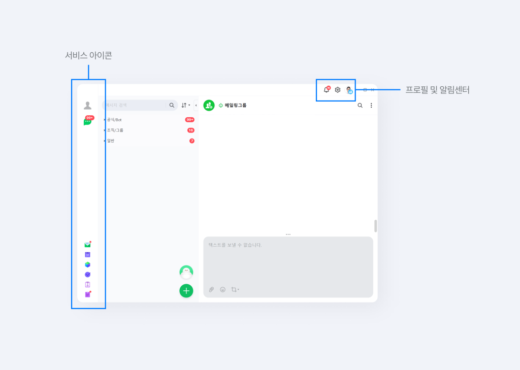 PC앱 좌측 배너에는 서비스 아이콘, 프로필 및 알림센터 등은 우측 상단에 배치하여 접근성을 향상하였습니다.