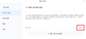 1) [환경설정 > 동기화 설정] ‘1:1 폴더 동기화 설정’에서 “추가” 버튼 선택