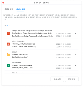동기화 중에 같은 파일을 서버와 내 컴퓨터에서 동시에 수정한 경우, 어느 쪽이 최신 버전인지 알 수 없어 ‘충돌’이 발생할 수 있습니다.