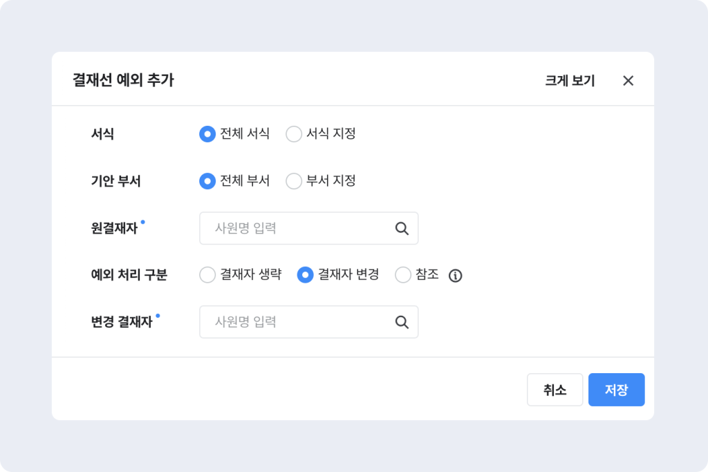 기안 유형별로 필요한 결재자를 지정하고, 언제든지 쉽게 불러올 수 있어요.