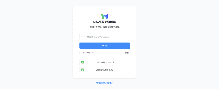 로그인 화면 변경 상품에 관계없이 NAVER WORKS 플랫폼이 제공하는 모든 상품이 함께 사용하는 신규 로그인 페이지가 제공됩니다. 기존 로그인 페이지 접속 시, 자동으로 신규 로그인 페이지로 연결됩니다. 신규 로그인 화면 신규 로그인 페이지는 기존 NAVER WORKS에서 제공하던 다양한 로그인 수단을 지원합니다. 단, 신규 출시되는 WORKS Drive 모바일 앱은 ‘LINE ID로 로그인’은 지원하지 않으므로 아래 방법을 통해 로그인을 해주시기 바랍니다. 휴대폰 번호로 로그인, 네이버 아이디로 로그인 또는 ID/PW를 입력해서 로그인하세요.위 3가지 로그인 수단 중 아무것도 없다면, PC웹으로 로그인하여 [우측 상단 톱니바퀴 아이콘 > 환경설정 > 보안]에서 세개 로그인 수단 중 하나를 등록하여 사용하세요.