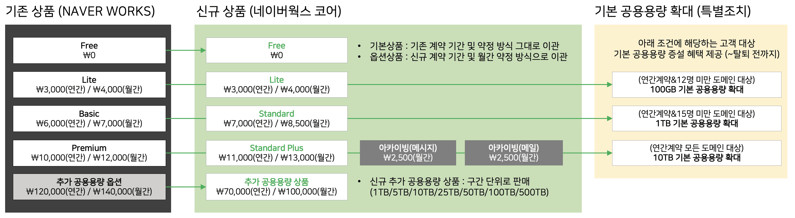 네이버웍스 플랫폼이 출시되면서 기존 NAVER WORKS의 상품명 및 요금, 스펙 구성이 변경됩니다. 기존 NAVER WORKS 고객은 네이버웍스 플랫폼 출시일에 맞춰 신규 상품으로 자동 이관됩니다.