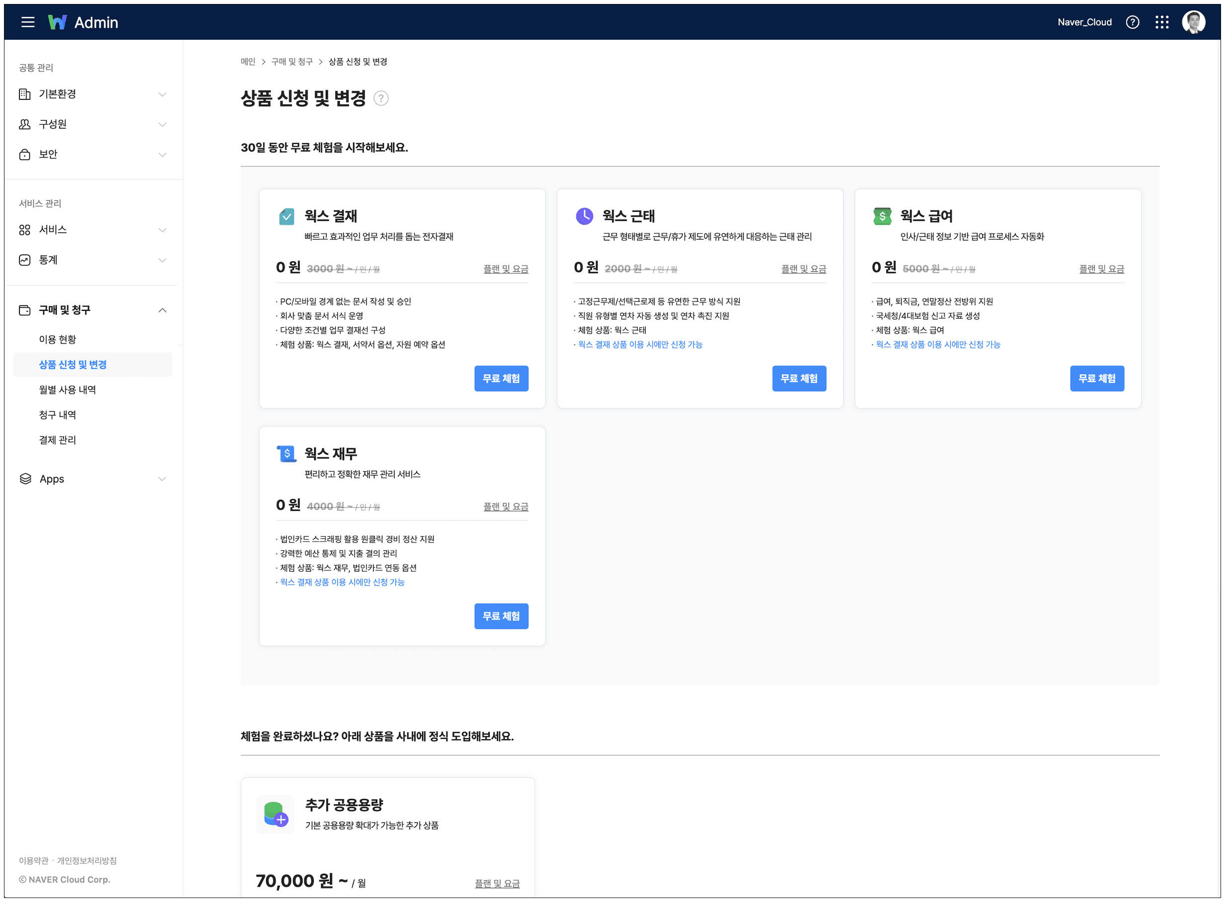 - [어드민 > 구매 및 청구 > 상품 신청 및 변경]에서 상품별로 체험판을 신청하거나 체험판의 유료 전환, 플랜 업그레이드, 상품별 갱신 옵션 설정, 상품 해지를 할 수 있습니다.