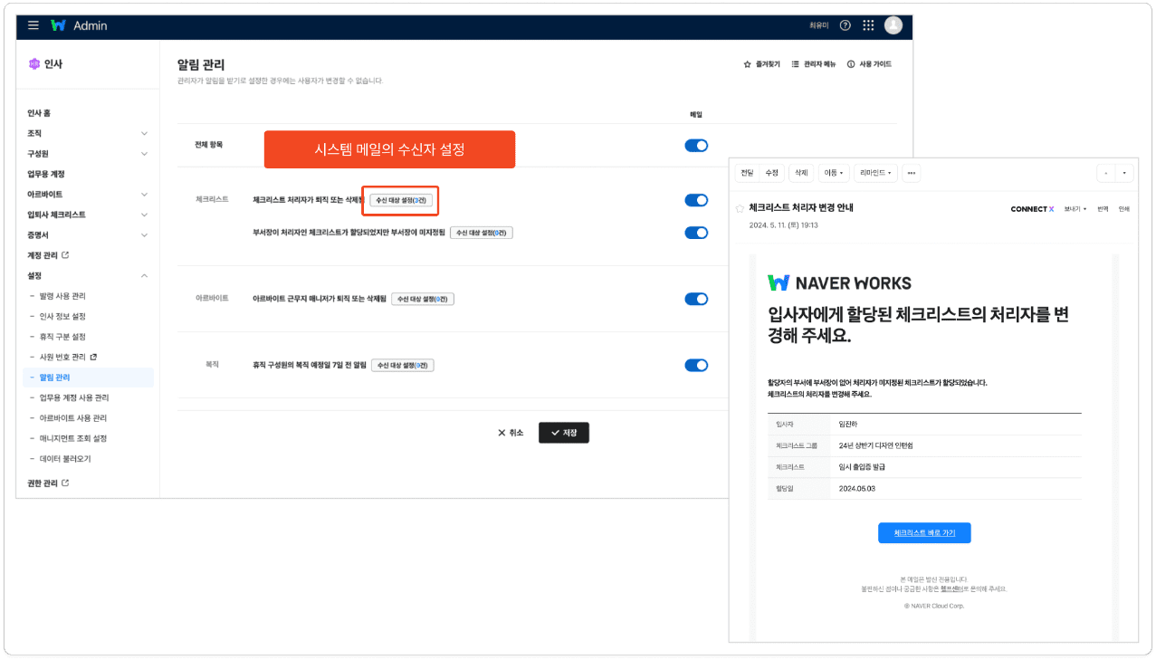- 기존 WORKPLACE Admin 관리자에게 발송되었던 메일은 본 메뉴에서 직접 수신자를 설정하는 방식으로 변경됩니다.